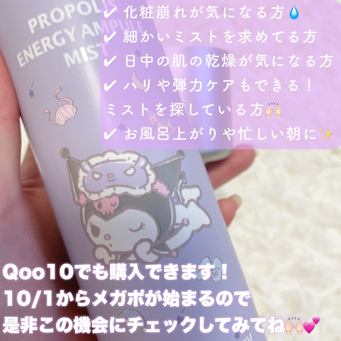 CNPのベストセラーミストのサンリオコラボエディション ねむねむのシナモン ૮๑ˊᯅˋ๑ა .。ƶƵ 使うたびに可愛い〜ってなる♡ 👉🏻プロポリス・7Vita-B Complex アンプルの高栄養成分で弾力とツヤ肌サポート 超微細霧噴射システムがすごいの細かいミストが超気持ちよくて!