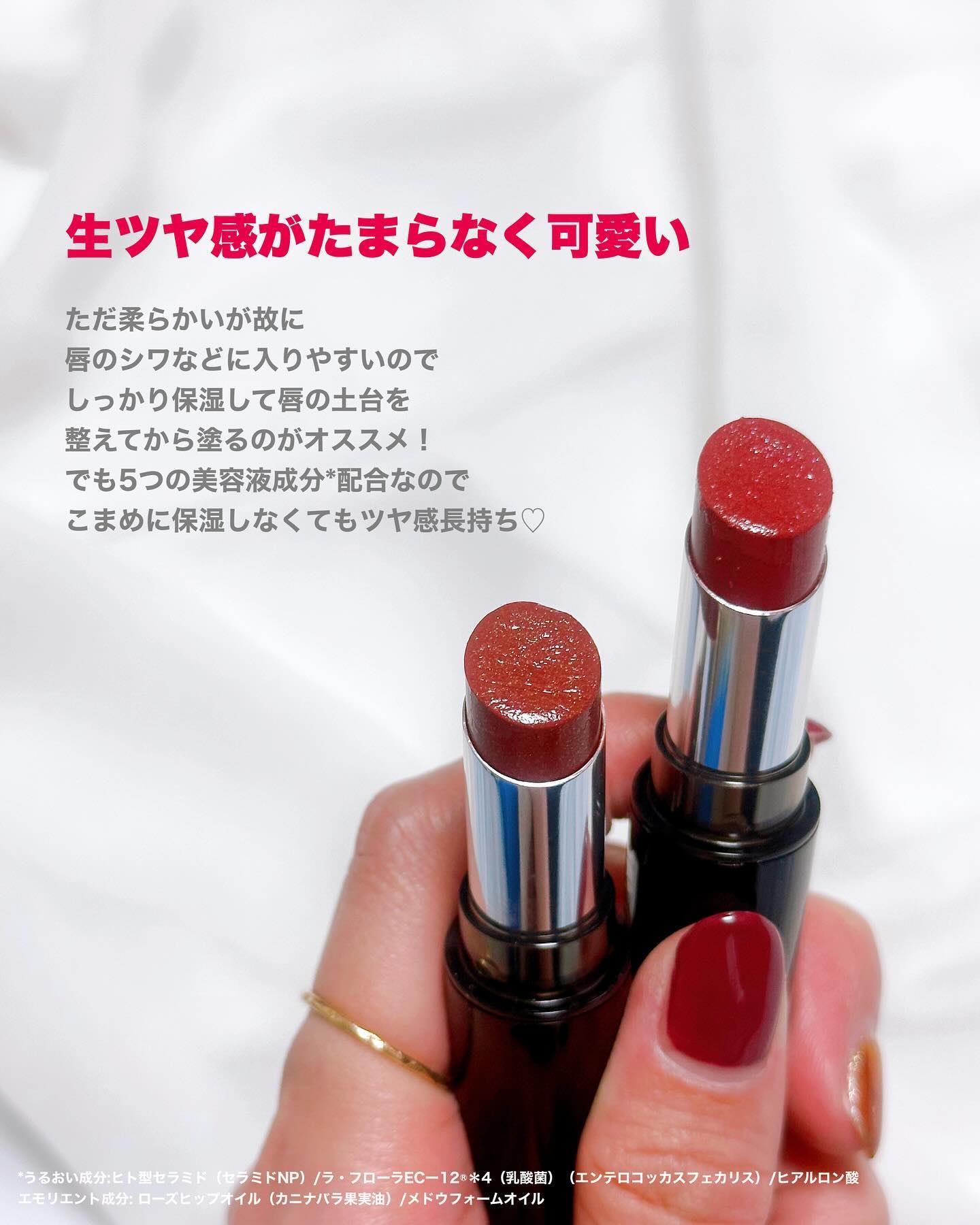 - 唇の荒れ・乾燥を防ぎ、色・ツヤ・うるおいキープ。粘膜*1ティント ●塗ると変化! ジェルコート形成 粘膜のようなしっとりとしたツヤ仕上がり ジェルコート膜が色・ツヤ・うるおい ラッピングでつけたての仕上がりを守る <5つの美容液成分配合> ●ヒト型セラミド*2、ラ・フローラEC-12®*3(乳酸菌)、ヒアルロン酸(うるおい成分) ●ローズヒップオイル*4、メドウフォームオイル(エモリエント成分) 縦じわカバー*5 /唇くすみカバー*5 /無香料 *1 粘膜のような質感や色のこと *2 セラミドNP *3 エンテロコッカスフェカリス *4 カニナバラ果実油 *5 メイクアップ効果による 販売店:2024年8月29日(木)よりロフトにて先行発売スタート。 2024年9月20日(金)から全国のアインズ&トルペ、 @cosme STORE/@cosme TOKYO/@cosme OSAKA、イオンリテール、イッツデモ、インキューブ、カラーフィールド、ドン・キホーテ、ハンズ、マツキヨココカラ&カンパニーグループ、ローズマリーなど[五十音順](一部店舗を除く)にて発売
