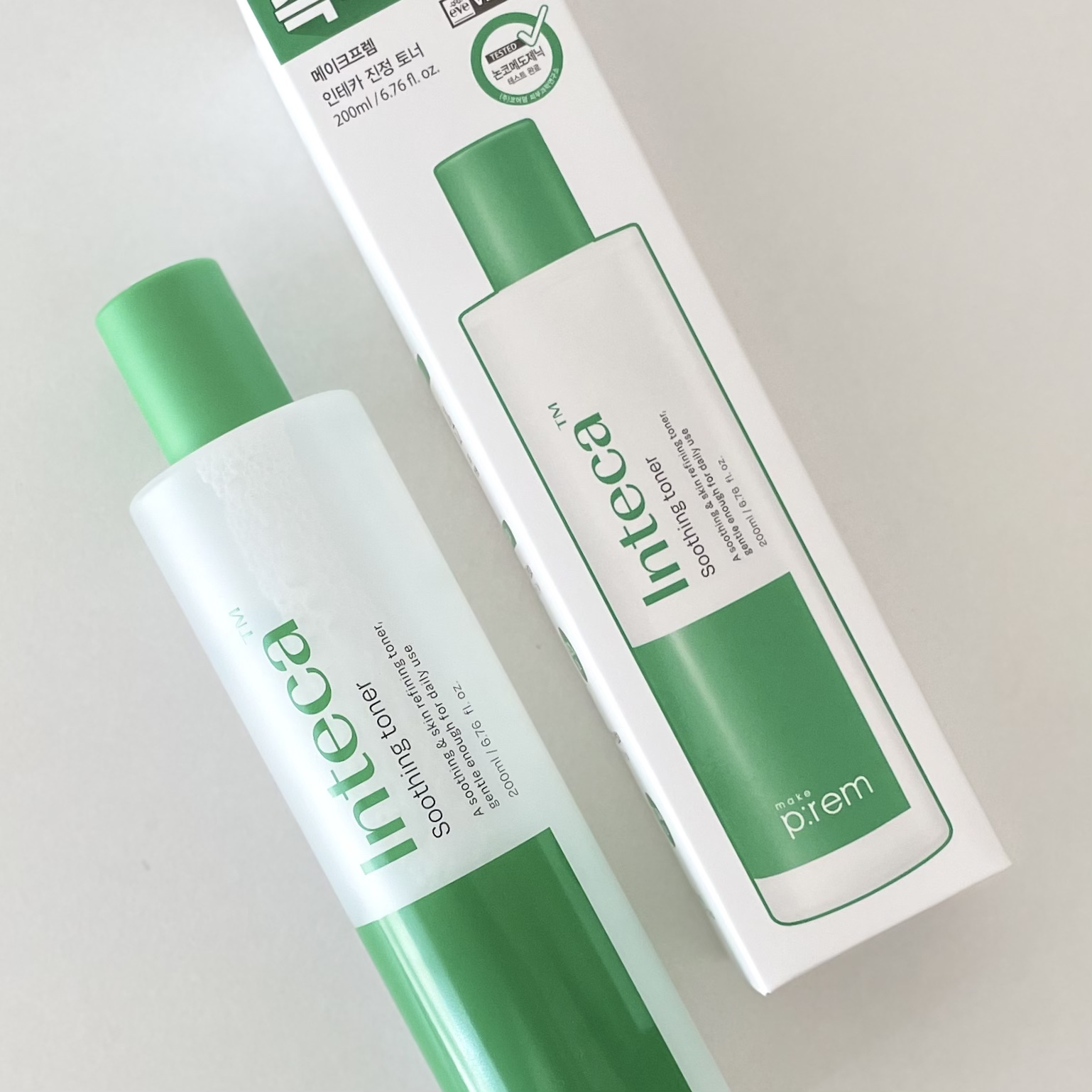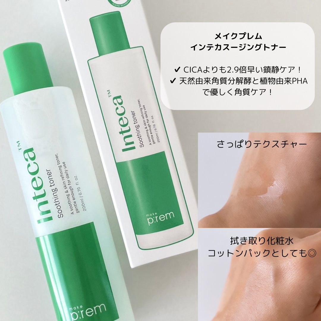 鎮静から角質ケアまでを叶えてくれる、メイクプレムのインテカスージングトナーを使用したよ🌱 ツボクサから抽出した鎮静ケア成分である「インテカ」がお肌を速やかにいたわり、植物由来モイスチャーコンプレックス3種類がお肌をしっとりと潤してくれるんだって🫧 ほんのりとする柑橘系?っぽい香りが心地よい🍋