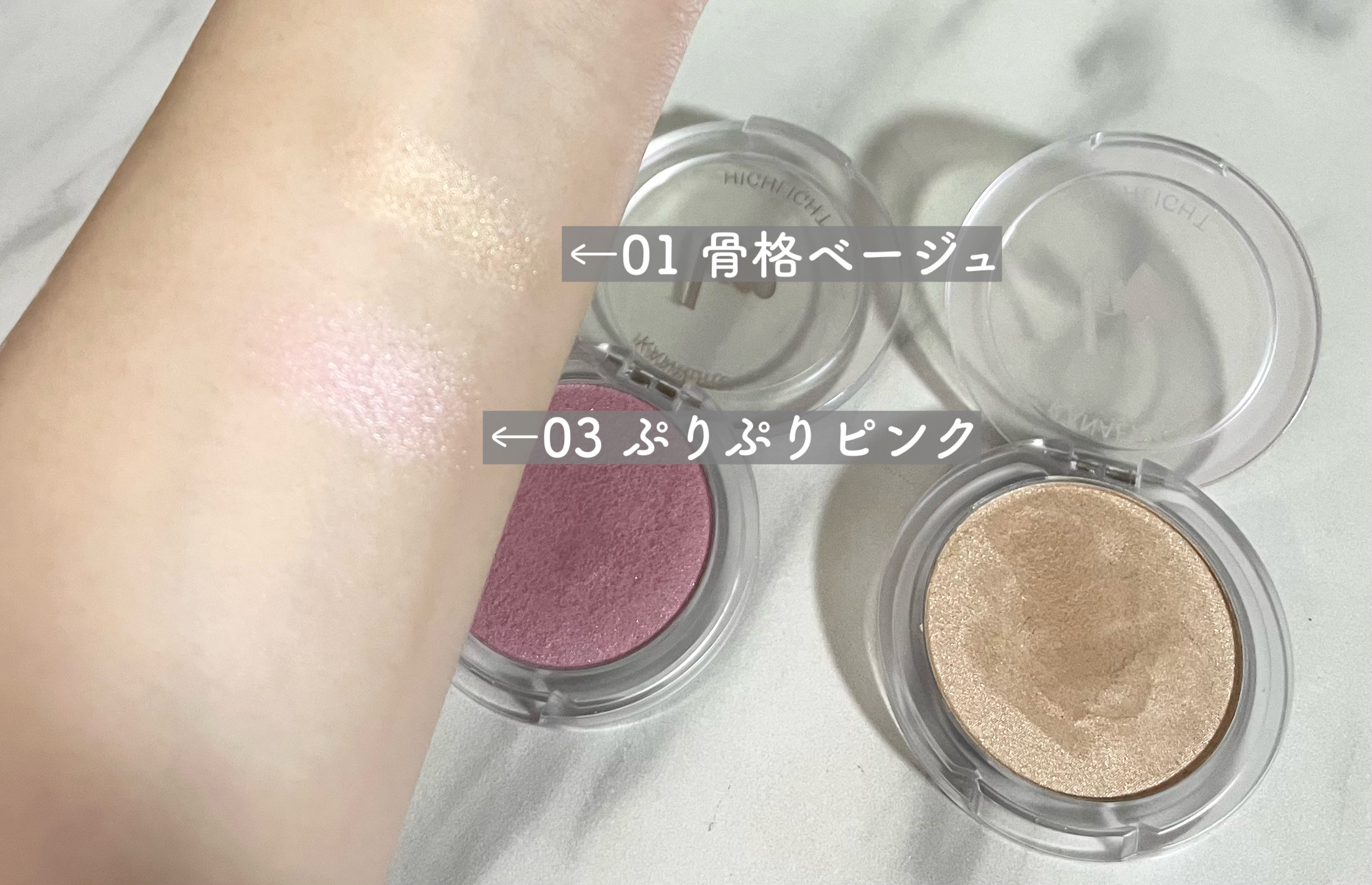 - b idolから新定番! 私にかける、魔法の光。 叶えるハイライト \立体感*血色*透明感/ 欲しいところにプラスする、シルキータッチなハイライト 骨格ベージュで顔全体をフラットになじませて、 鼻高ホワイトで鼻筋や額、高く見せたい所にポイント使い♪ ぷりぷりピンクはチーク使いでかわいく仕込む♡ お肌のことを考えた美容成分*配合なので使いやすい◎ マルチに使える3色展開!コンパクトなのでもち運びにもとっても便利。 *ティーツリー葉油、ヒアルロン酸Na、セラミドNP(全て保湿成分) <01 骨格ベージュ> 自然に溶け込む立体ベージュ <02 鼻高ホワイト> 透明感をひきあげるポイントマーブル <03 ぷりぷりピンク> やわらかな丸みを仕込む血色ピンク ※全てメイクアップ効果