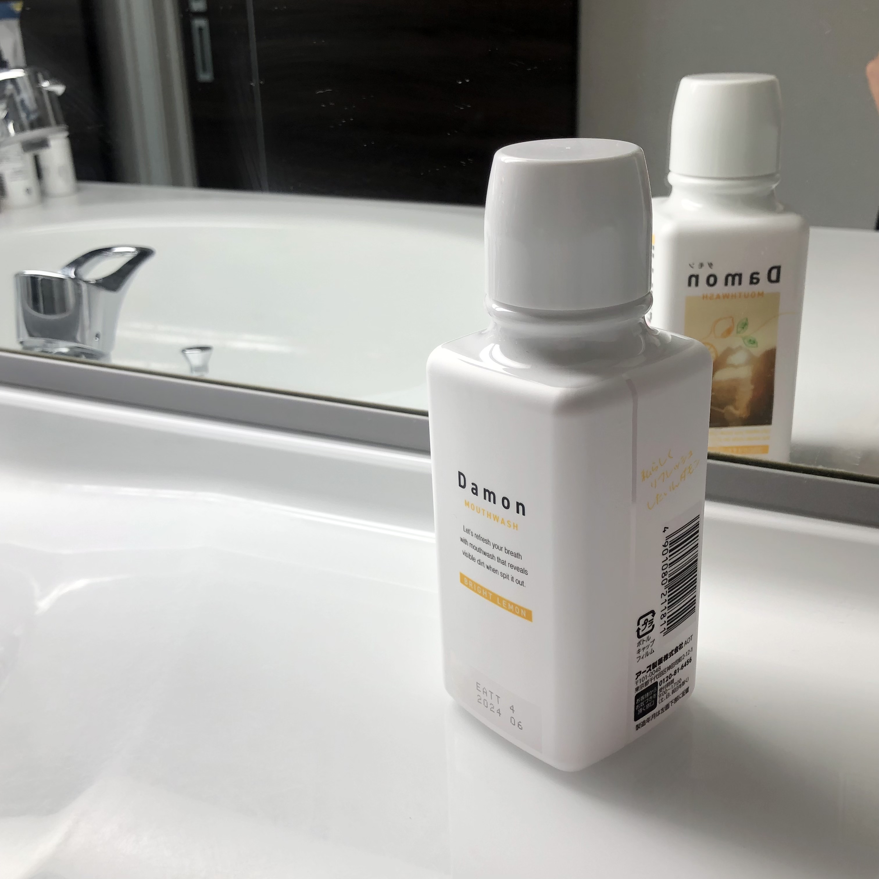 汚れが見える洗口液Damon(ダモン)は、吐き出すと汚れが出てきてすっきりするマウスウォッシュ。 約20秒ほどお口をクチュクチュした後に吐き出すと、タンパク質汚れが塊りとして出てきます。なぜ汚れが見えるかというと、大気中にはタンパク質が含まれていて、口臭の原因でもあるタンパク質が凝集され汚れと一緒に吐き出されることで目に見えるようになります。 Damon(ダモン)は380mlと試しやすく、手のひらサイズで洗面台にもすっきり置けます。また、洗口液らしくないオシャレなリバーシブルデザインで、裏面のシンプルパッケージを選ぶこともできます。