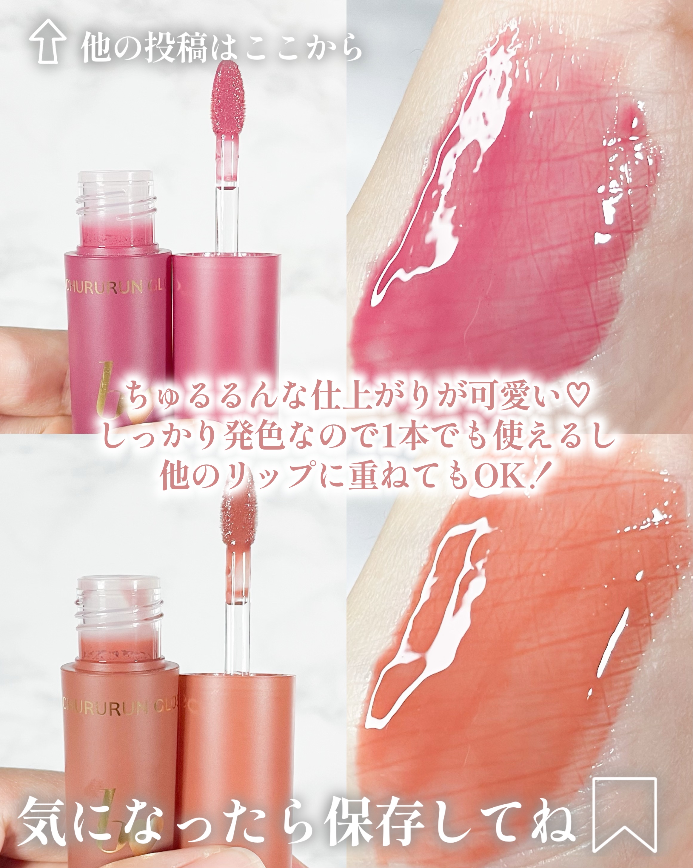- 【重ねて塗って、唇だけで虜にする。】 むっちりぷっくり*1艶リップを演出♥ 24SS新定番発売! 「スキンケア感覚の艶グロス」 “ちゅるるんグロス” ラップパック×美容成分配合*2×潤いを閉じ込める こっくり系テクスチャーでぷっくりツヤツヤ。 美容成分がたっぷりで、ぴったり密着ラッピング。 乾燥から唇を保護します。 ぽってり*1♡うるちゅるな唇を演出。 ♥「01 ヌードスキン」うるうるしながら、可愛く守る。 *1 メイク効果による *2 シア脂、ツバキ種子油、カニナバラ果実油、セラミドNP、ティーツリーエキス、ヒアルロン酸Na、ツボクサエキス(全て保湿成分) うるうるしながら、可愛く守る。 スキンケア感覚の艶グロス。