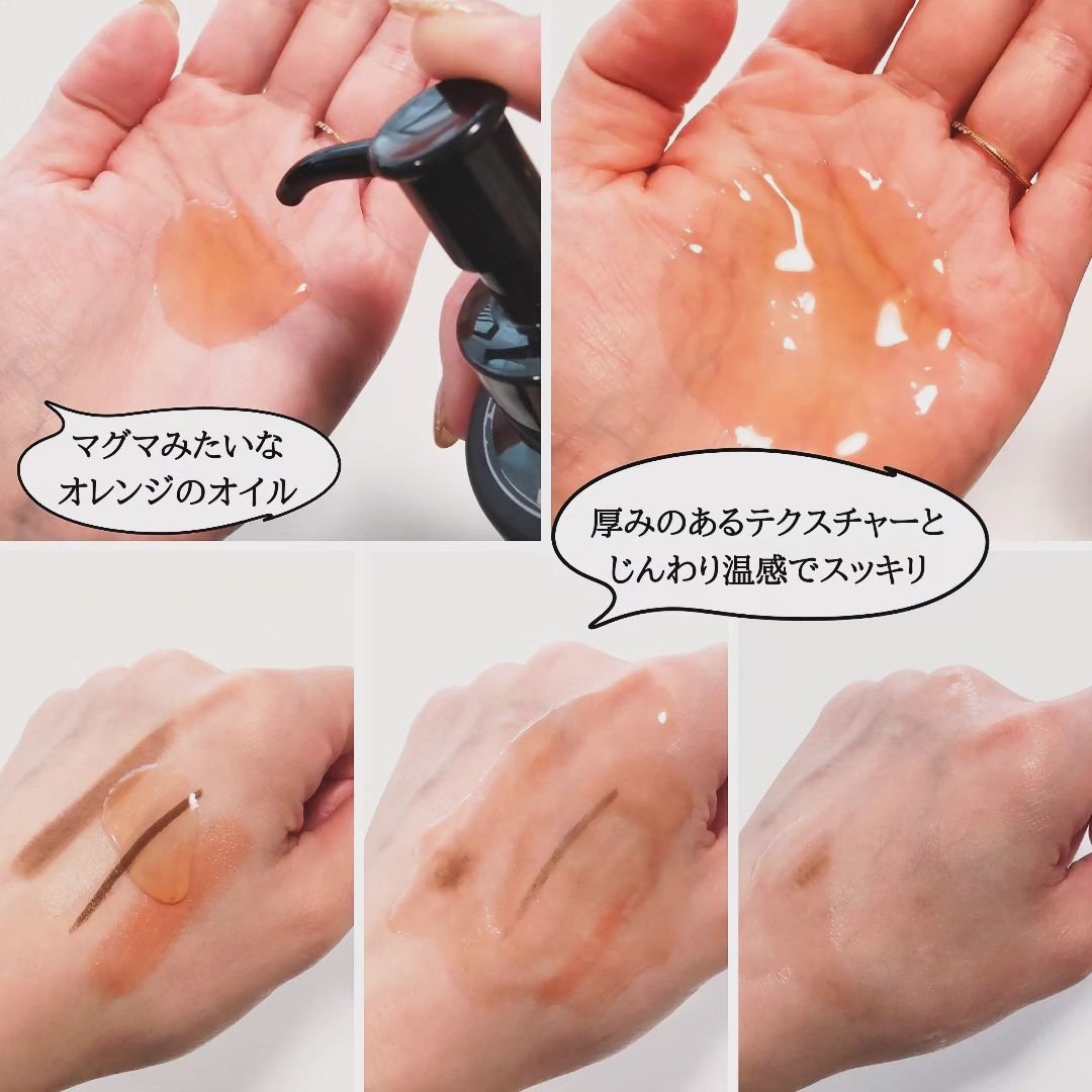 - ・温感オイル×ミネラルパウダー*5× 美容成分*4でメイクを落としながらしっかり毛穴ケア! *4 ノイバラ果実エキス、アーチチョーク葉エキス、ユキノシタエキス、ショウガ根エキス[保湿成分] *5 溶岩末、火山土、炭、モロッコ溶岩クレイ、タナクラクレイ、カオリン[清浄成分] 肌にのばすと瞬時に“温感”を感じるオイルタイプのクレンジング。オレンジ色のオイルは煮えたぎるように熱いマグマを表現しています。 ■するっと!角栓ディープクリア処方 マグマのような温感オイルがじんわり肌をほぐしながら、メイクに素早くなじみ、毛穴汚れや角栓を溶かします。さらに、ミネラルパウダー*5がしつこい毛穴の黒ずみ*3、皮脂汚れを吸着してかき出します。 *3 古い角質 *5 溶岩末、火山土、炭、モロッコ溶岩クレイ、タナクラクレイ、カオリン[清浄成分] ■毛穴汚れ・ざらつきにアプローチするミネラルパウダー*5配合! マグマに由来する溶岩末*1、火山土*1のほか、炭*1、吸着クレイ*2といったミネラルパウダーを配合。気になる毛穴の汚れやざらつき・角栓にアプローチしてしっかり除去します。 *1 清浄成分 *2 モロッコ溶岩クレイ、タナクラクレイ、カオリン[清浄成分] *5 溶岩末、火山土、炭、モロッコ溶岩クレイ、タナクラクレイ、カオリン[清浄成分] ■毛穴の目立たないつるすべ肌*6へ導く美容成分*4配合! 植物由来の美容成分*4配合で、肌のキメを整え、毛穴の目立たないつるすべ肌*6へ。 *4 ノイバラ果実エキス、アーチチョーク葉エキス、ユキノシタエキス、ショウガ根エキス[保湿成分] *6 うるおいによる肌印象 ■W洗顔不要 ■マツエクO K ■ぬれた手O K ■マグマをイメージしたデザイン パッケージ・ビジュアルは、力強さを表現するブラックをベースに、熱いマグマがどろっと流れるイメージをデザインしています。