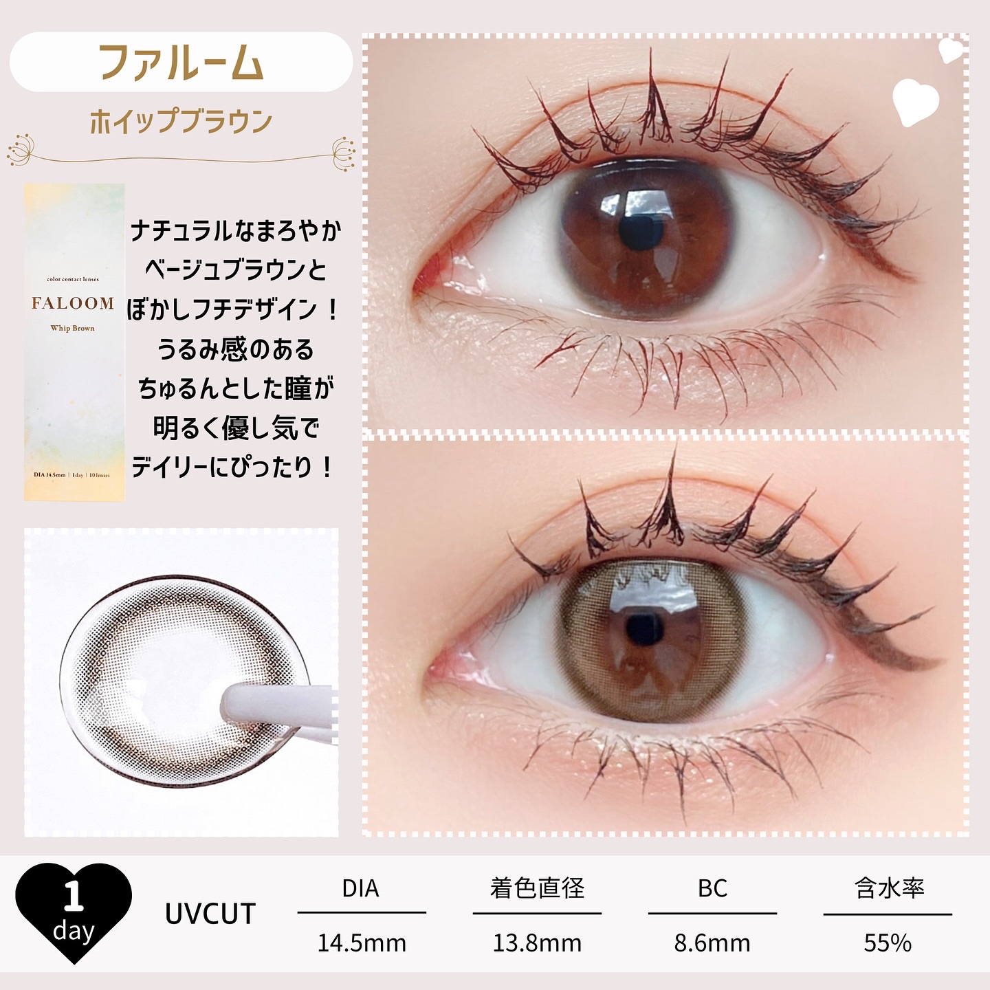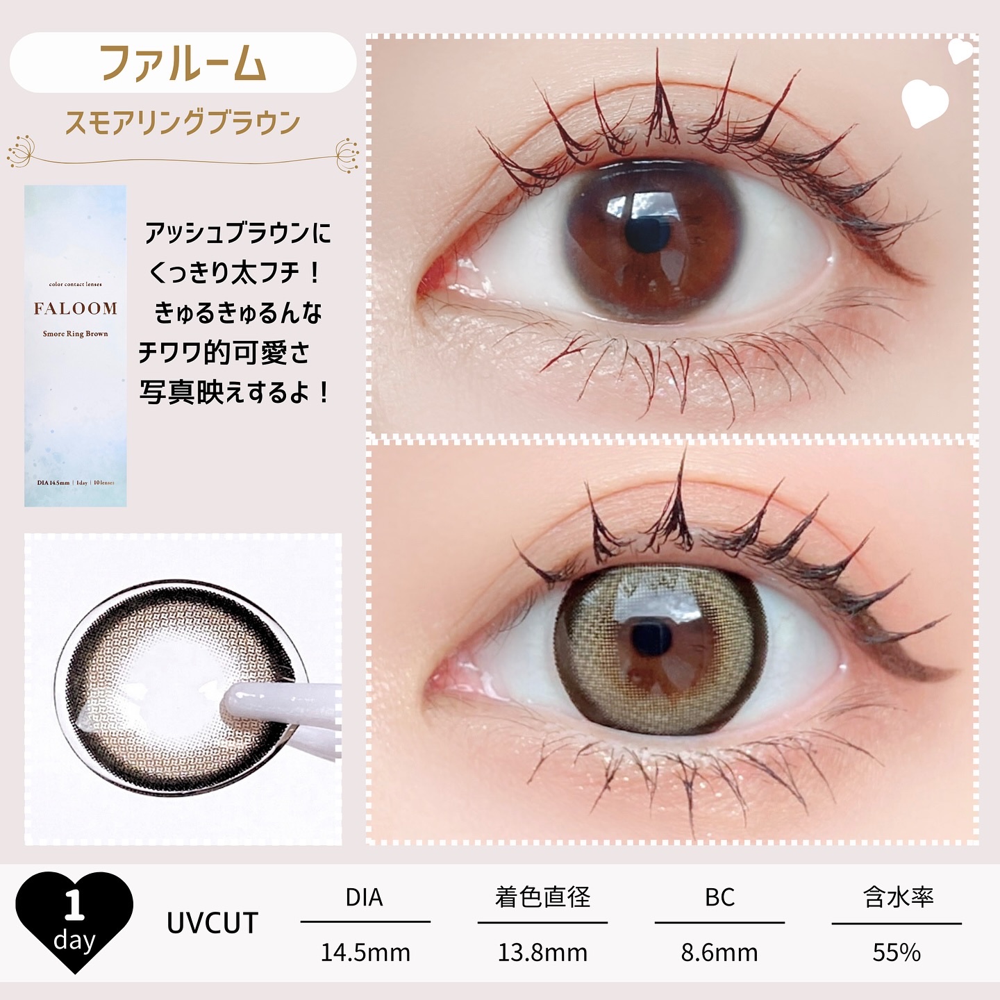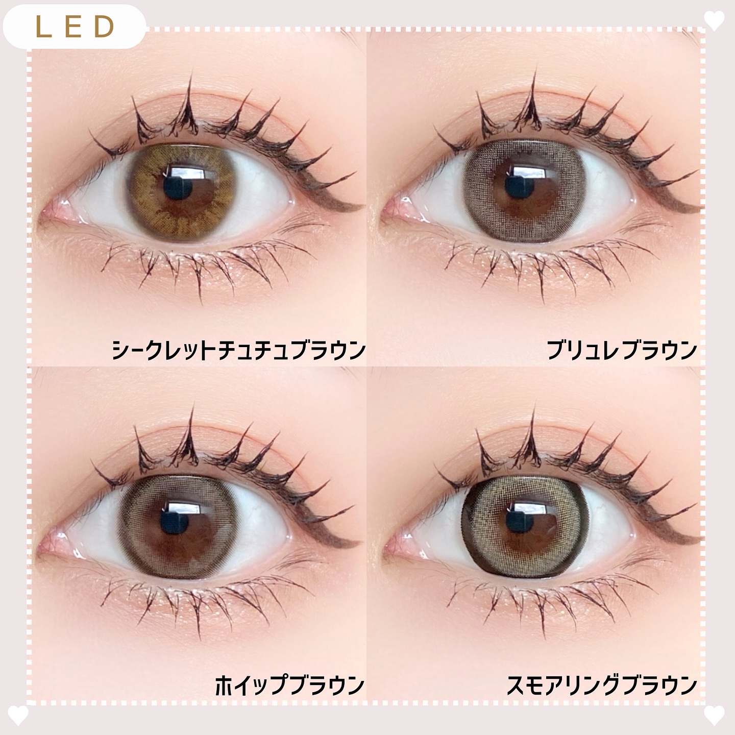 - ※2025年6月以降、商品パッケージ裏面・側面の一部表記を順次変更いたします。尚、これにかかる商品の交換・返品は承っておりません。 『わたしにハマる♡盛れ発色ブラウン』4色のカラーラインナップ ■ヒミツのちゅるんブラウン Secret Tutu Brown (シークレットチュチュブラウン) DIA:14.2mm 着色直径:11.2mm ニュアンスブラウンカラーが自然に瞳のトーンアップを演出してくれる裸眼風デート系レンズ。 ■はかなげ大人っぽブラウン Brulee Brown(ブリュレブラウン) DIA:14.5mm 着色直径:13.8mm トレンドの白っぽブラウン×ふわっとフチデザインで、大人っぽい瞳を演出。 ■甘っぽモテブラウン Whip Brown(ホイップブラウン) DIA:14.5mm 着色直径:13.8mm まろやかベージュブラウン×ぼかしフチデザインで、明るく優し気な瞳を演出。 ■あざとよくばりブラウン Smore Ring Brown(スモアリングブラウン) DIA:14.5mm 着色直径:13.8mm こなれアッシュブラウン×くっきり太フチデザインで、きゅるっと可愛らしい瞳を演出。 カラーコンタクトレンズの不適正使用による眼障害の危険性等などがあります。 ●コンタクトレンズは高度管理医療機器です。不十分な洗浄・消毒など不適切なケアや、長時間・交換期間を超えた装用により、アレルギー性結膜炎、角膜感染症、角膜潰瘍等の重篤な眼障害が発生する危険性があります ●ご使用前に取扱説明書を確認してください 使用上の留意事項 ●眼科医院等を受診してからお求めください ●眼に異常を感じたら直ちにレンズ使用を中止し、お近くの眼科等で診察を受けてください ●医師の指示にしたがってご使用ください ●コンタクトレンズを装用する場合、自覚症状がなくても、眼科医院等での定期検査を受けてください ●レンズに不具合がある場合は使用しないでください