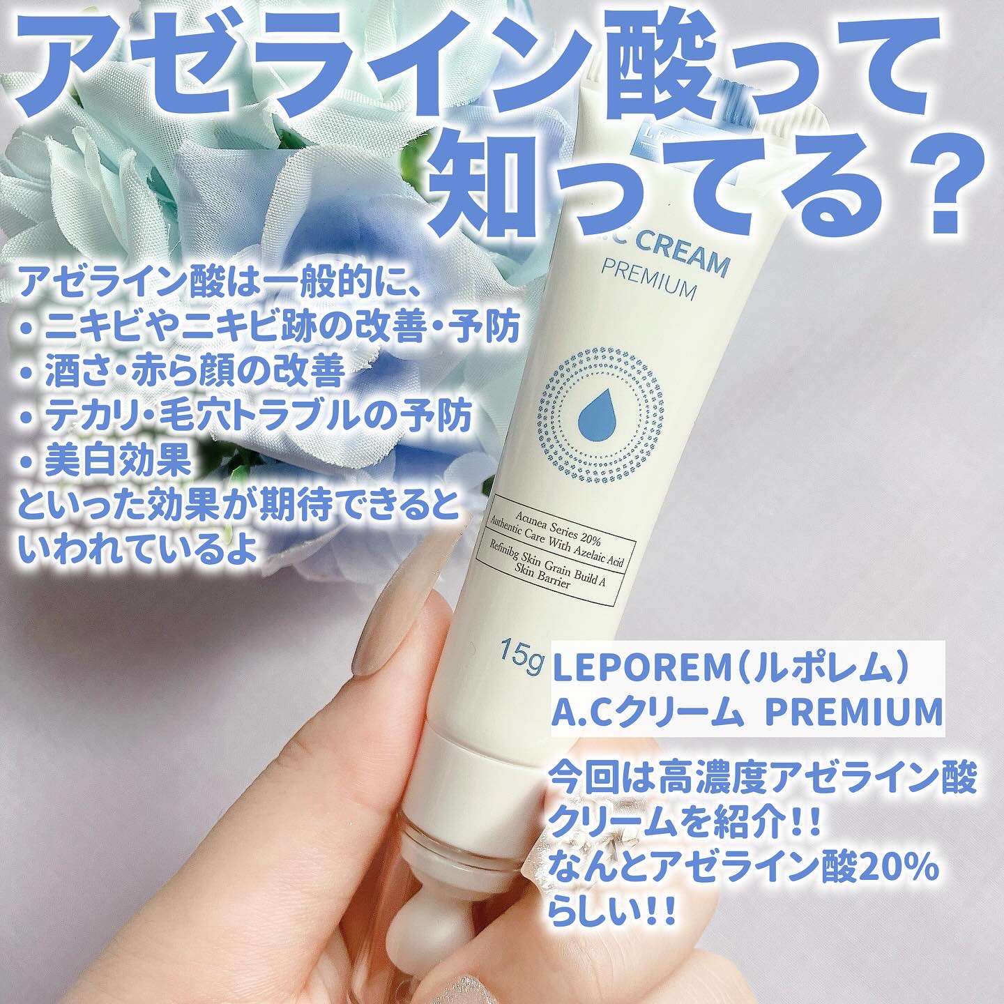 .LEPOREM(ルポレム)A.CクリームPREMIUM\皮脂からくる肌トラブルに/最近話題のアゼライン酸が20%配合されたクリーム✨アゼライン酸誘導体ではなく、純アゼライン酸を使用しているのがポイント!•ニキビやニキビ跡の改善・予防•酒さ(...