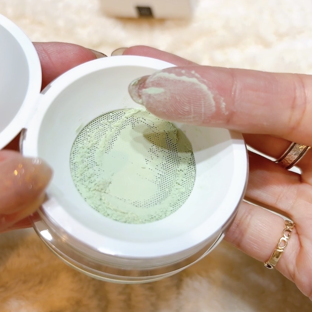 ホワイト・スキンベージュ、・グリーン、・ラベンダー、・ベビーピンクの5色展開。自分のなりたい肌トーンに合わせて、選べる。 頬や小鼻の赤みをグリーンのフェイスパウダーでカバー。・サラサラでなめらかなパウダー。 超微粒子パウダーで、毛穴をふんわりカバー。