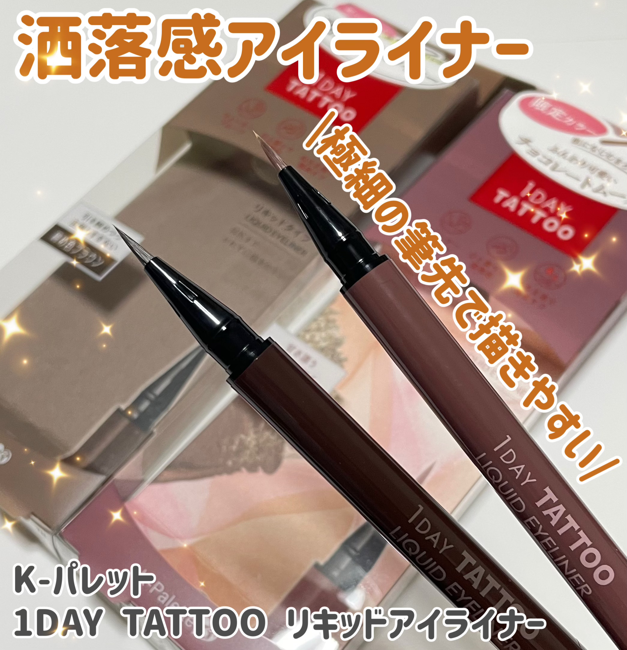 - 『色味』『洒落感』にこだわった新生!『K-パレット 1DAY TATTOO リキッドアイライナー』が登場! 【商品特徴】 1色味の「使いやすさ」と「洒落感」を両立したオリジナルの「スキントーン・カラー」 2メイクや肌トーンに馴染みやすいカラーだから抜け感が生まれ、垢抜け顔に♫ 3「ハイブリッドTATTOO FILM」で朝のキレイを崩さない 4オリジナル「ブレンド筆」で感動の描き心地 5 7種の美容保湿成分配合 6ぬるま湯で簡単オフ! 7色素沈着しにくい! 8速乾・にじみにくい