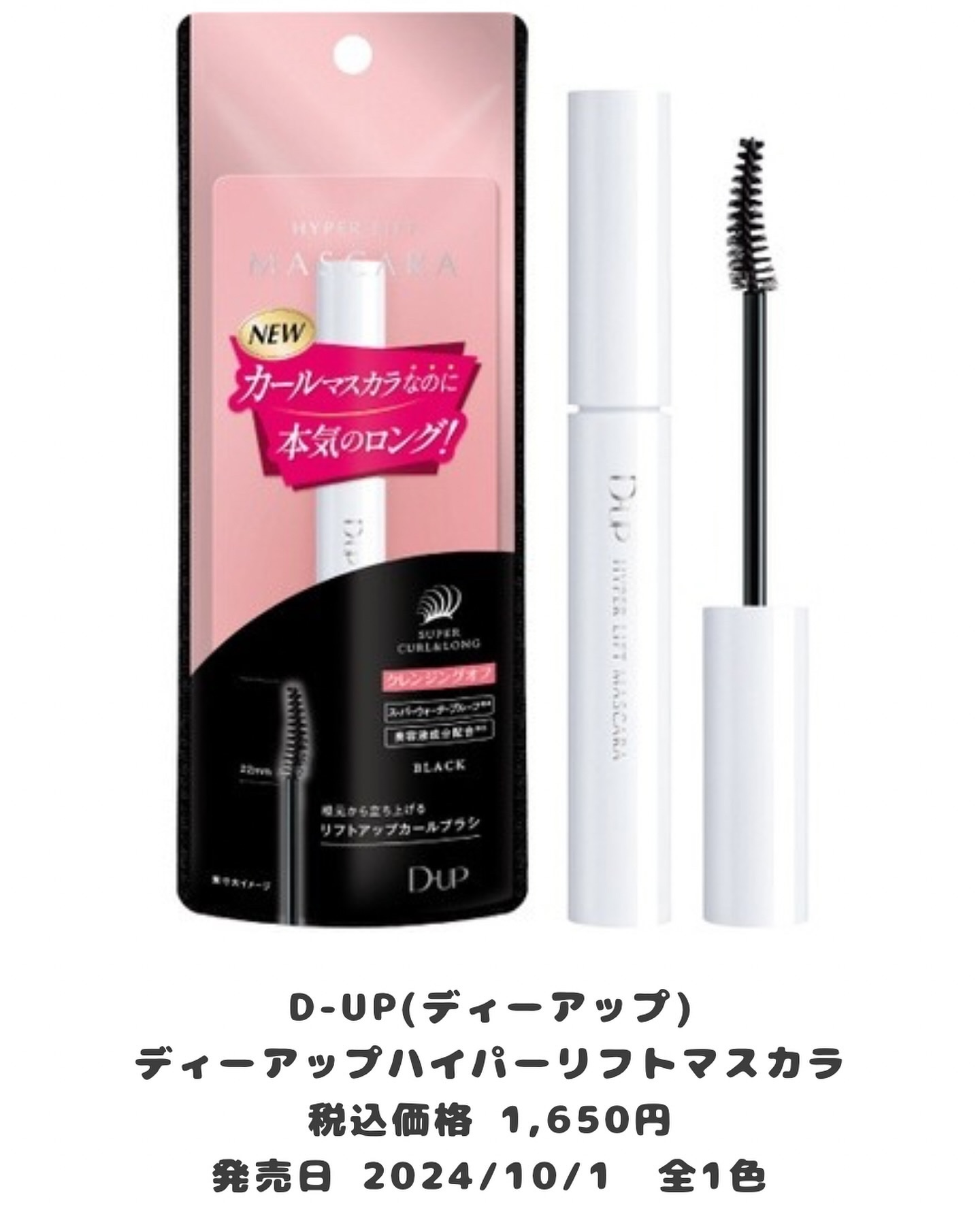- 2024年10月1日より全国のバラエティショップ、ドラッグストア、公式オンラインショップ(https://store.d-up.co.jp/)にて発売いたします。 『ハイパーリフトマスカラ』は、“カールマスカラで本気のロング”をコンセプトに、ディーアップ史上最強のカールキープ力と驚きの長さを追求した新しいマスカラです。 ■カールキープ力とロング感の両立 カールキープ力の高いマスカラは、通常ワックスや被膜材でカールをキープしますが、同時に「ロング感」や「ダマの無い仕上がり」を両立させることは難しいとされてきました。ハイパーリフトマスカラは、あと1㎜長く、もっとなめらかにするための改良を重ね、「カールキープ力」と「ロング」どちらも限界レベルまで欲張った新処方です。 ■1㎜でも長く!「すご伸びカール」 ロングの秘密は、なめらかで“伸び感”のあるカール液。ファイバーを包み込みながら素早く毛先まで絡み、美しくスッと長いまつげを実現します。 さらに長さを出すため「まつげの根元」にも着目し、生え際から持ち上げて伸ばす、コンパクトなリフトアップカールブラシを新たに採用しました。 『ハイパーリフトマスカラ』で、想像を超える“新次元の上向きまつげ”を体験してください。