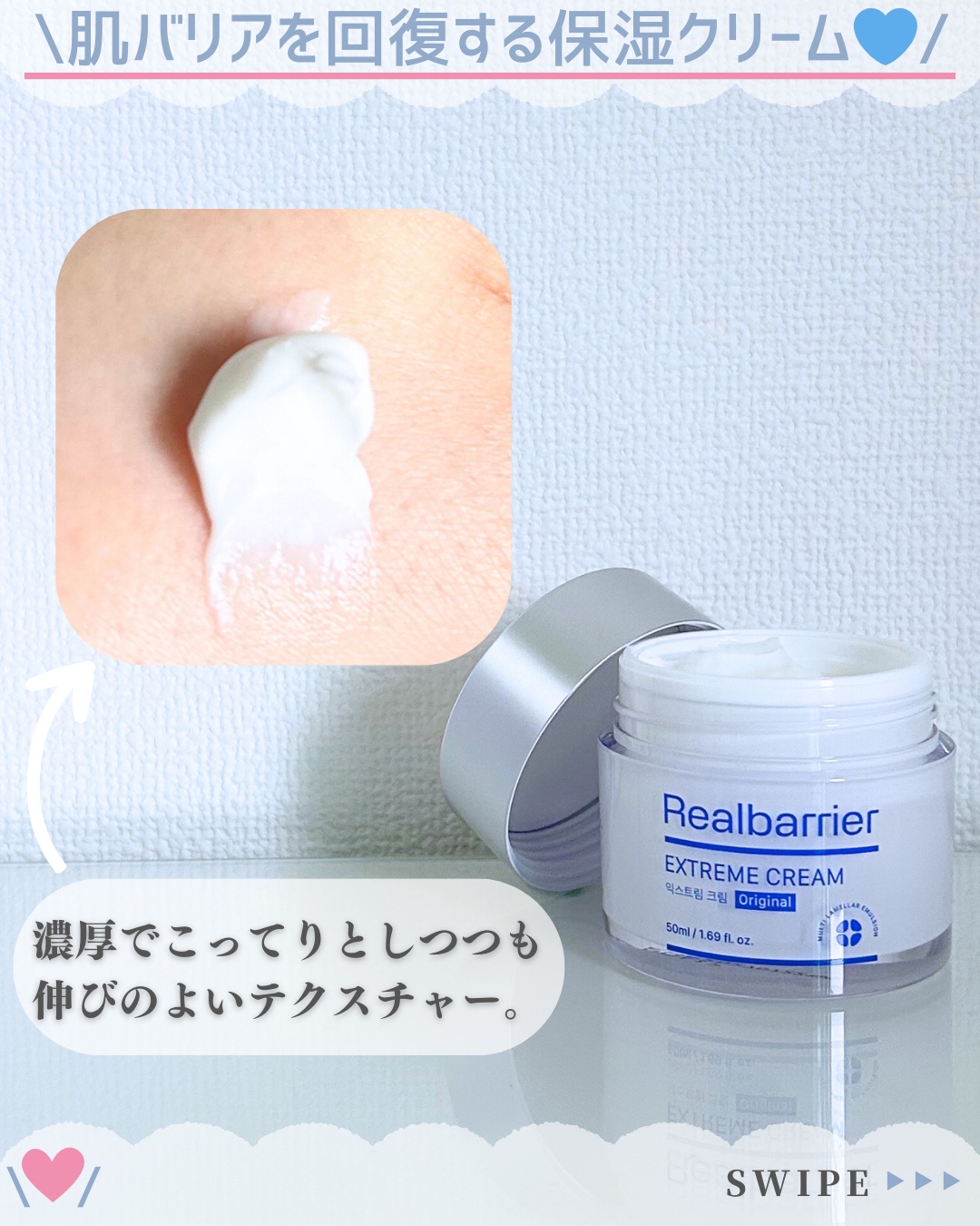 崩れた肌バリアを回復させて乾燥を改善する機能性保湿クリーム🤍 コックリと固めの質感なのに肌に溶け込むように馴染む高保湿フェイスクリーム✨️ リアルバリア独自開発のMLE(R)テクノロジーを採用したMLE(R)肌バリア処方で肌のバリア機能をしっかりと補いうるおいに満ちたふっくらハリ肌に導いてくれる! オリジナルよりも軽いやわらかテクスチャーで軽い着け心地なのにしっかりしっとりしてくれる!