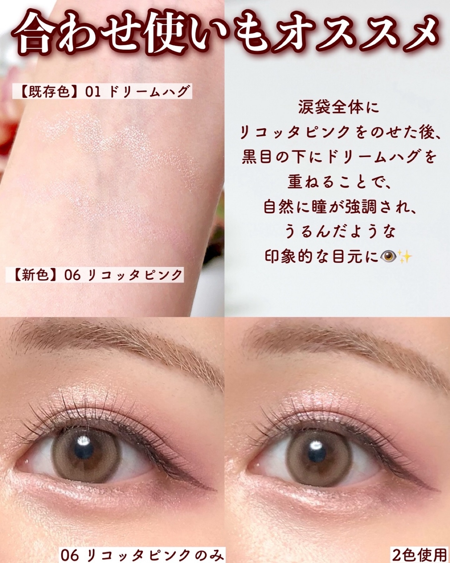 コレはモテ確定のアイシャドウと私の中で決定した 左上: 偏光パールがチラつく珍しいピンクカラー 右上:ホワイトやピンクのラメが煌めくカラー 真ん中: 柔らかいパール入りのベージュ 左下:シアーな赤。少し温かみのあるコーラル感も感じます 右下:マットカラーの赤みのあるブラウン これはね、動画でも伝わらないぐらいラメが繊細で可愛いんだよね😍 女の子らしさが溢れんばかりの儚げピンク💗
