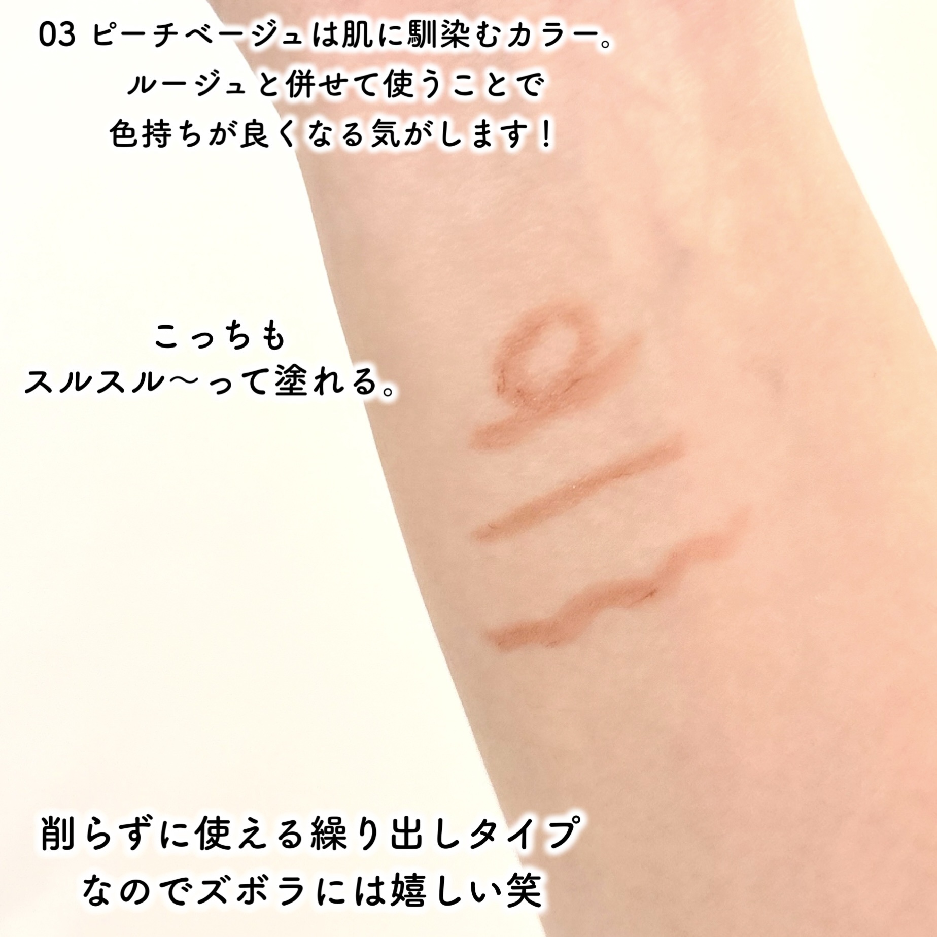| なめらかにするする塗れて、塗った瞬間から唇に色がピタっと密着する感じ。 | 詳細を見る | |