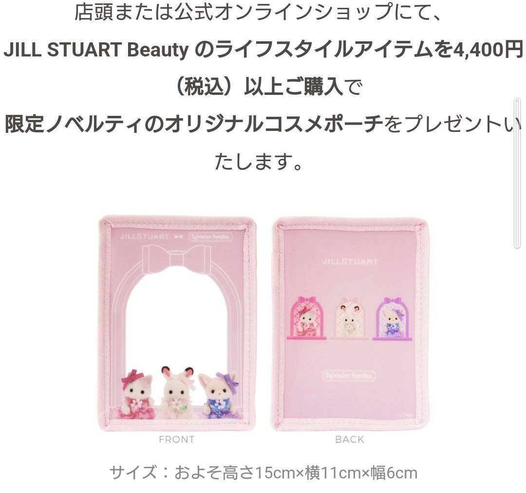 JILLSTUARTとシルバニアファミリーのコラボが始まりました! JILLSTUARTをイメージしたシルバニアファミリーの赤ちゃんが登場しました! 店頭または公式オンラインショップにて、JILL STUART Beauty のライフスタイルアイテムを4,400円(税込)以上ご購入で限定ノベルティのオリジナルコスメポーチが貰えます! 可愛すぎるコスメポーチがもらえる期間は…🩷 ♡店頭での実施:10月4日(金)開店~10月31日(木)閉店