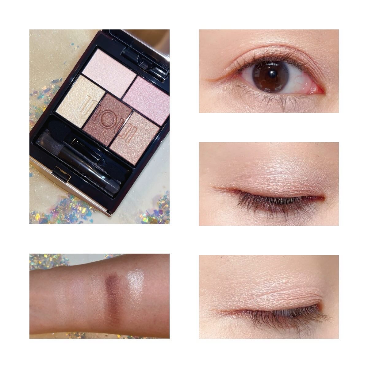 春カラーが好き🌸 春シーズンは欲しいものがたくさんでした。 左下のラメが繊細で綺麗✨ 公式通り、右上&左下をアイホール&下瞼、右下を目の際、左上をアイホールに重ねて。 アプリコット&ピスタチオというオシャレカラーで、繊細なラメ入り。 色持ちはよくて、食事後もしっかり色残りアリ。 縦皺も気にならないし、多分他のカラーも追加購入していくんだろうなぁ…🤣