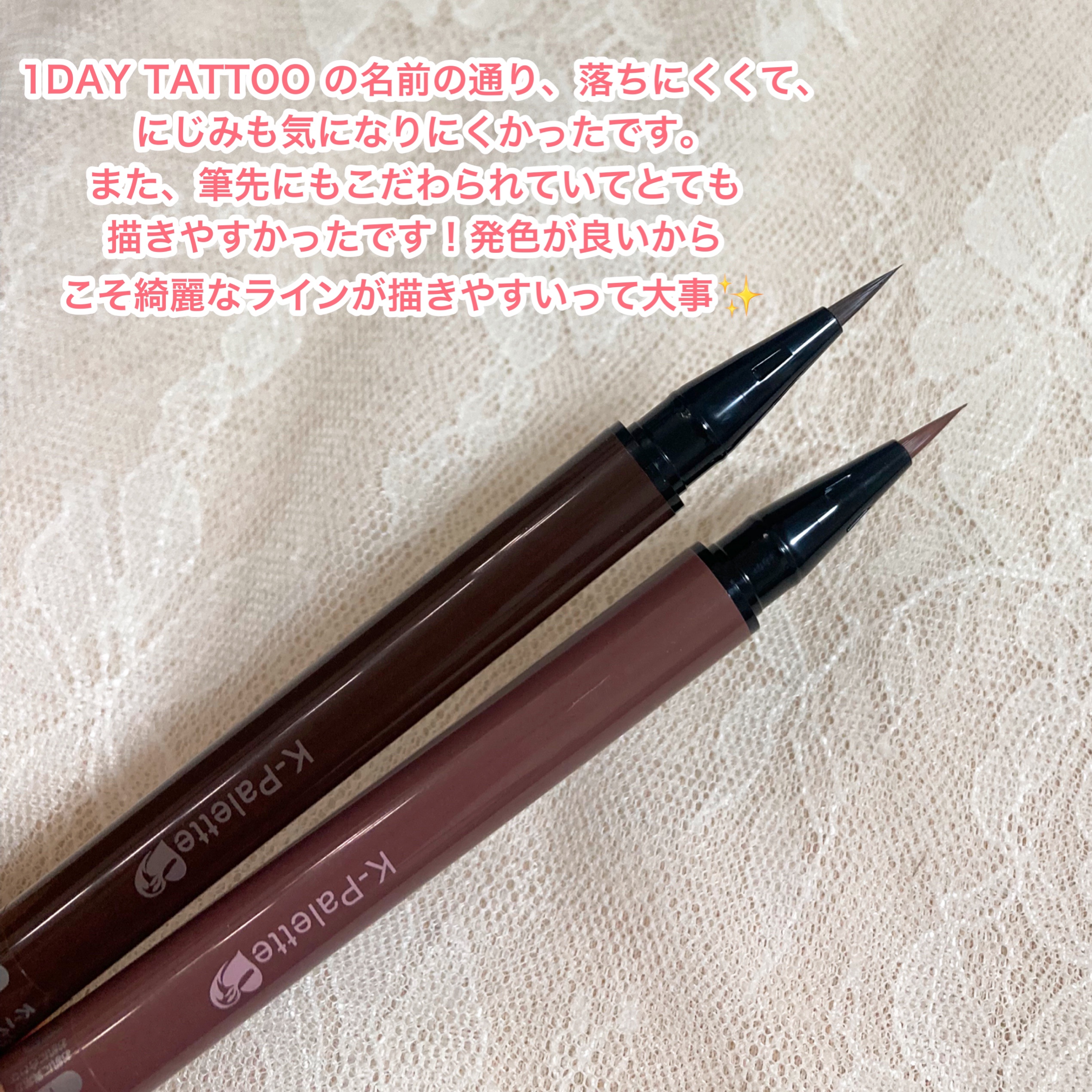 - 『色味』『洒落感』にこだわった新生!『K-パレット 1DAY TATTOO リキッドアイライナー』が登場! 【商品特徴】 1色味の「使いやすさ」と「洒落感」を両立したオリジナルの「スキントーン・カラー」 2メイクや肌トーンに馴染みやすいカラーだから抜け感が生まれ、垢抜け顔に♫ 3「ハイブリッドTATTOO FILM」で朝のキレイを崩さない 4オリジナル「ブレンド筆」で感動の描き心地 5 7種の美容保湿成分配合 6ぬるま湯で簡単オフ! 7色素沈着しにくい! 8速乾・にじみにくい