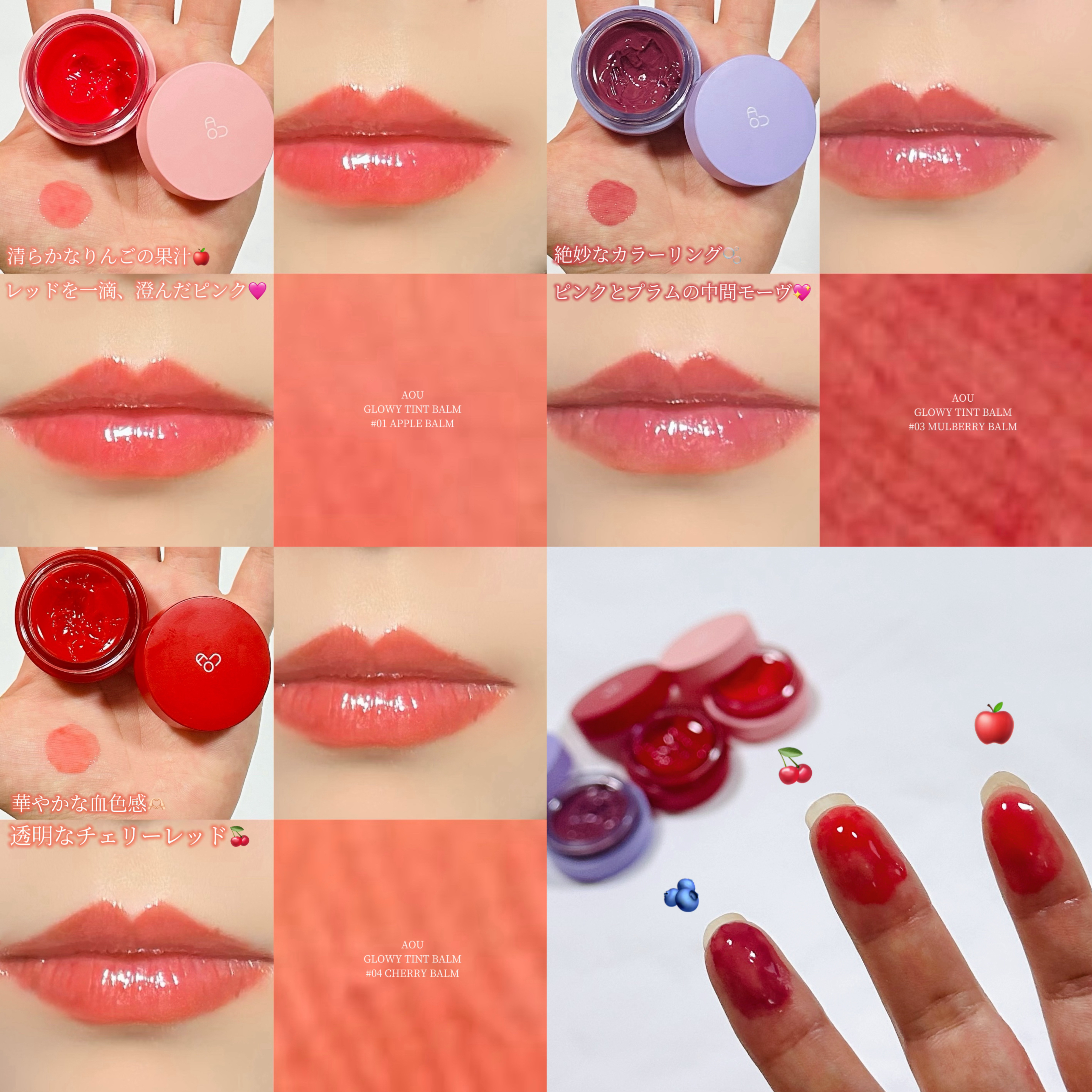 - <01 APPLE BALM> Hydrogenated Polyisobutene、Bis-Behenyl/Isostearyl/Phytosteryl Dimer Dilinoleyl Dimer Dilinoleate、Phytosteryl/Isostearyl/Cetyl/Stearyl/Behenyl Dimer Dilinoleate、Bis-Diglyceryl Polyacyladipate-2、Diisostearyl Malate、Microcrystalline Wax、Pyrus Malus (Apple) Seed Oil、Sucrose Tetrastearate Triacetate、Synthetic Fluorphlogopite、Synthetic Wax、Silica Silylate、Ethylene/Propylene Copolymer、Polyglyceryl-2 Triisostearate、Titanium Dioxide (CI 77891)、Yellow 6 Lake (CI 15985)、Red 7 Lake (CI 15850) 'Red 7 Lake' applied to this formula have to be labelled 'Aka 202' for Japan、Caprylyl Glycol、Glyceryl Caprylate、Polyglyceryl-2 Diisostearate、Red 27 (CI 45410)、Tocopherol、Water、Butyrospermum Parkii (Shea) Butter、Helianthus Annuus (Sunflower) Seed Oil、Hydrolyzed Hyaluronic Acid、Rosa Canina Fruit Oil、Butylene Glycol、1,2-Hexanediol、Rubus Idaeus (Raspberry) Fruit Extract、Vaccinium Macrocarpon (Cranberry) Fruit Extract <02 PERSIMMON BALM> Hydrogenated Polyisobutene、Bis-Behenyl/Isostearyl/Phytosteryl Dimer Dilinoleyl Dimer Dilinoleate、Phytosteryl/Isostearyl/Cetyl/Stearyl/Behenyl Dimer Dilinoleate、Bis-Diglyceryl Polyacyladipate-2、Diisostearyl Malate、Microcrystalline Wax、Pyrus Malus (Apple) Seed Oil、Sucrose Tetrastearate Triacetate、Synthetic Fluorphlogopite、Synthetic Wax、Polyglyceryl-2 Triisostearate、Silica Silylate、Yellow 5 Lake (CI 19140)、Ethylene/Propylene Copolymer、Titanium Dioxide (CI 77891)、Red 7 Lake (CI 15850) 'Red 7 Lake' applied to this formula have to be labelled 'Aka 202' for Japan、Polyglyceryl-2 Diisostearate、Caprylyl Glycol、Glyceryl Caprylate、Iron Oxides (CI 77491)、Orange 5 (CI 45370)、Red 21 (CI 45380)、Water、Butylene Glycol、Butyrospermum Parkii (Shea) Butter、Helianthus Annuus (Sunflower) Seed Oil、Hydrolyzed Hyaluronic Acid、Rosa Canina Fruit Oil、1,2-Hexanediol、Rubus Idaeus (Raspberry) Fruit Extract、Vaccinium Macrocarpon (Cranberry) Fruit Extract、Camellia Japonica Leaf Extract、Ceratonia Siliqua (Carob) Fruit Extract、Diospyros Kaki Fruit Extract <03 MULBERRY BALM> Hydrogenated Polyisobutene、Bis-Behenyl/Isostearyl/Phytosteryl Dimer Dilinoleyl Dimer Dilinoleate、Phytosteryl/Isostearyl/Cetyl/Stearyl/Behenyl Dimer Dilinoleate、Bis-Diglyceryl Polyacyladipate-2、Diisostearyl Malate、Microcrystalline Wax、Pyrus Malus (Apple) Seed Oil、Sucrose Tetrastearate Triacetate、Synthetic Fluorphlogopite、Synthetic Wax、Polyglyceryl-2 Triisostearate、Silica Silylate、Titanium Dioxide (CI 77891)、Red 33 Lake (CI 17200)、Ethylene/Propylene Copolymer、Iron Oxides (CI 77491)、Yellow 6 Lake (CI 15985)、Caprylyl Glycol、Glyceryl Caprylate、Red 7 Lake (CI 15850) 'Red 7 Lake' applied to this formula have to be labelled 'Aka 202' for Japan、Blue 1 Lake (CI 42090)、Polyglyceryl-2 Diisostearate、Red 27 (CI 45410)、Water、Butylene Glycol、Butyrospermum Parkii (Shea) Butter、Helianthus Annuus (Sunflower) Seed Oil、Hydrolyzed Hyaluronic Acid、Morus Alba Root Extract、1,2-Hexanediol、Rubus Idaeus (Raspberry) Fruit Extract、Morus Alba Fruit Extract、Morus Alba Leaf Extract、Vaccinium Macrocarpon (Cranberry) Fruit Extract <04 CHERRY BALM> Hydrogenated Polyisobutene、Bis-Behenyl/Isostearyl/Phytosteryl Dimer Dilinoleyl Dimer Dilinoleate、Phytosteryl/Isostearyl/Cetyl/Stearyl/Behenyl Dimer Dilinoleate、Diisostearyl Malate、Bis-Diglyceryl Polyacyladipate-2、Microcrystalline Wax、Pyrus Malus (Apple) Seed Oil、Sucrose Tetrastearate Triacetate、Synthetic Fluorphlogopite、Synthetic Wax、Silica Silylate、Ethylene/Propylene Copolymer、Caprylyl Glycol、Glyceryl Caprylate、Iron Oxides (CI 77491)、Polyglyceryl-2 Triisostearate、Butyrospermum Parkii (Shea) Butter、Simmondsia Chinensis (Jojoba) Seed Oil