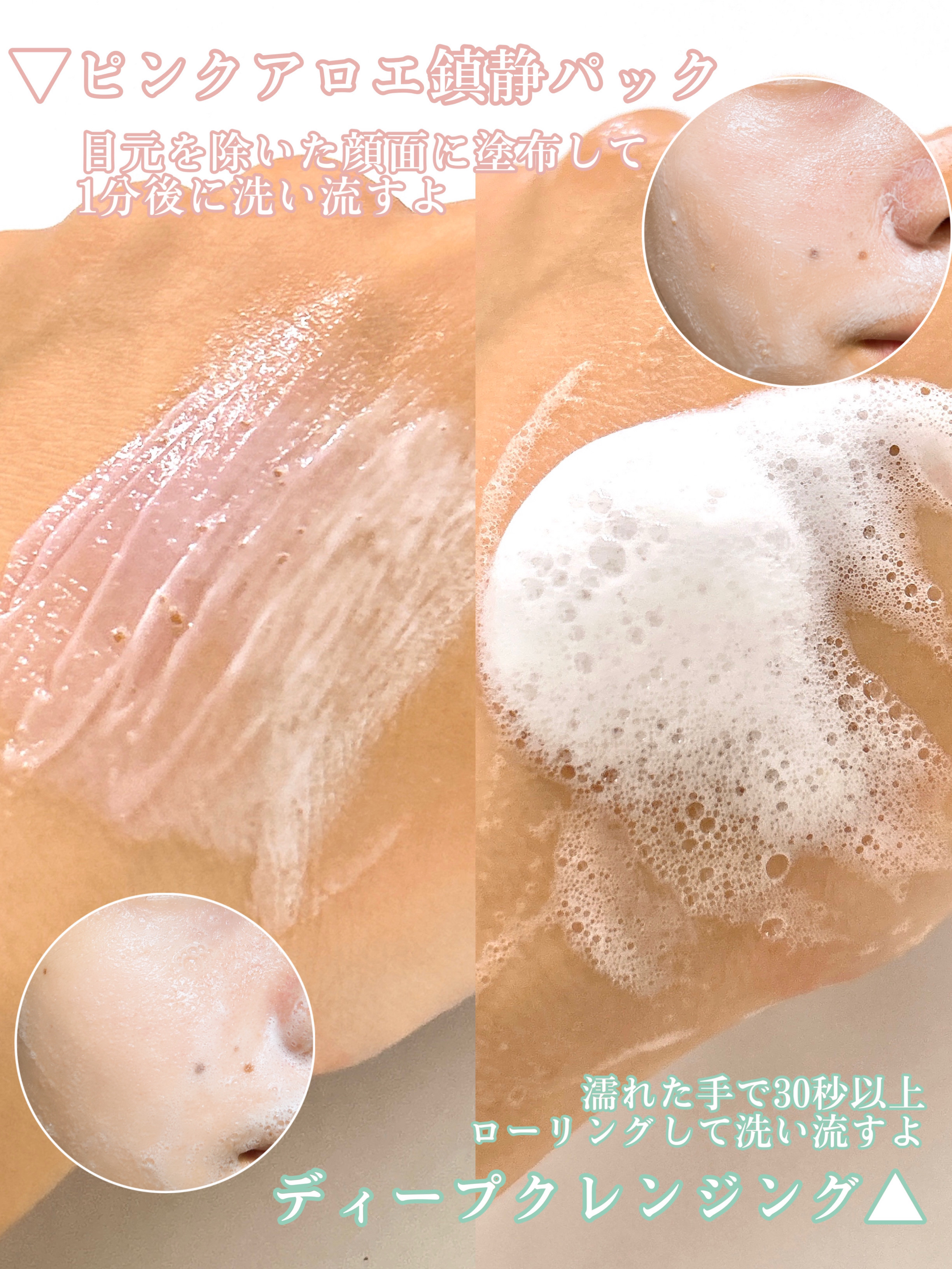鎮静成分が198% 高いピンクアロエ🩷(※アロエ成分内polyphenol含有量) 可愛すぎるクレンザー🥰 甘い香りも可愛くて世界観にきゅんとします♡ 便利な2wayタイプで①パック 目元を除いた顔面に塗布 1分後優しく洗い流す