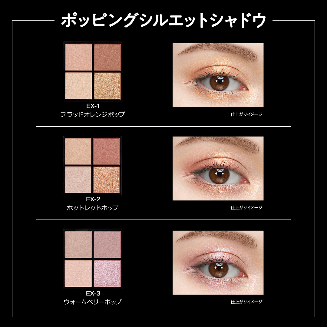 質感トリックで、クリッと丸い 2.5次元アイに仕上がるポッピングシルエットシャドウ 今回登場した限定色はほんのり血色感を盛れる火照りカラー 特に気に入ったのはEX-2こちらの色は人気なようで近隣店舗では売り切れていたため、私は花王公式通販で購入しました📦