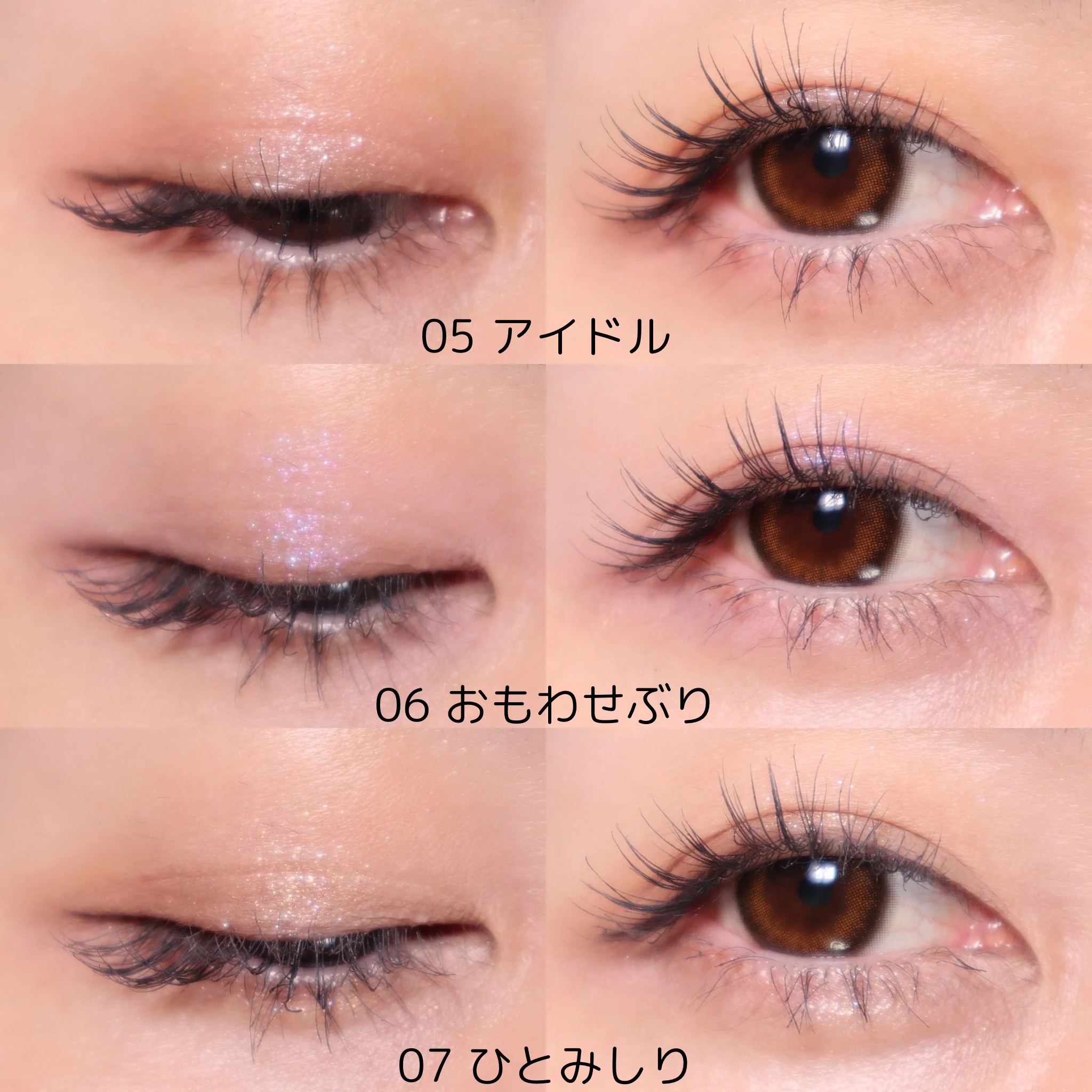 - <01 甘えんぼ> マイカ、タルク、ホウケイ酸(Ca/Al)、酸化チタン、ジメチコン、合成ワックス、パルミチン酸エチルヘキシル、ポリメタクリル酸メチル、ステアリン酸亜鉛、パルミチン酸亜鉛、ポリブテン、酢酸トコフェロール、ビスジグリセリルポリアシルアジペート-2、マンガンバイオレット、トリエトキシカプリリルシラン、フェノキシエタノール、酸化鉄、カプリリルグリコール、赤226、グンジョウ、酸化スズ、シリカ、赤202 <02 わがまま> タルク、マイカ、ジメチコン、合成ワックス、ポリメタクリル酸メチル、酸化チタン、酸化鉄、ステアリン酸亜鉛、ホウケイ酸(Ca/Na)、パルミチン酸エチルヘキシル、ホウケイ酸(Ca/Al)、パルミチン酸亜鉛、合成フルオロフロゴパイト、ポリブチレンテレフタレート、ポリブテン、トリエトキシカプリリルシラン、フェノキシエタノール、ビスジグリセリルポリアシルアジペート-2、酢酸トコフェロール、カプリリルグリコール、シリカ、赤226、酸化スズ、アクリレーツコポリマー <03 ツンデレ> マイカ、タルク、酸化チタン、ジメチコン、ホウケイ酸(Ca/Al)、合成ワックス、合成フルオロフロゴパイト、酸化鉄、パルミチン酸エチルヘキシル、ポリメタクリル酸メチル、ステアリン酸亜鉛、パルミチン酸亜鉛、ポリブテン、カオリン、ビスジグリセリルポリアシルアジペート-2、トリエトキシカプリリルシラン、マンガンバイオレット、フェノキシエタノール、シリカ、酢酸トコフェロール、カプリリルグリコール、赤226、酸化スズ <04 気まぐれ> マイカ、タルク、ホウケイ酸(Ca/Al)、合成フルオロフロゴパイト、合成ワックス、ジメチコン、パルミチン酸エチルヘキシル、ステアリン酸亜鉛、ポリメタクリル酸メチル、酸化鉄、パルミチン酸亜鉛、酸化チタン、ポリブテン、ビスジグリセリルポリアシルアジペート-2、ホウケイ酸(Ca/Na)、酢酸トコフェロール、マンガンバイオレット、フェノキシエタノール、シリカ、カプリリルグリコール、トリエトキシカプリリルシラン、酸化スズ <05 アイドル> タルク、マイカ、合成フルオロフロゴパイト、ジメチコン、合成ワックス、シリカ、酸化チタン、カオリン、酸化鉄、ミリスチン酸Mg、ホウケイ酸(Ca/Al)、窒化ホウ素、パルミチン酸エチルヘキシル、ステアリン酸亜鉛、水酸化Al、パルミチン酸亜鉛、トリエトキシカプリリルシラン、酢酸トコフェロール、フェノキシエタノール、ポリイソブテン、黄4、ビスジグリセリルポリアシルアジペート-2、カプリリルグリコール、赤202、赤201、酸化スズ <07 ひとみしり> タルク、マイカ、ホウケイ酸(Ca/Al)、合成ワックス、パルミチン酸エチルヘキシル、ジメチコン、シリカ、カオリン、酸化鉄、ミリスチン酸Mg、酸化チタン、ステアリン酸亜鉛、窒化ホウ素、合成フルオロフロゴパイト、パルミチン酸亜鉛、トリ(カプリル酸/カプリン酸)グリセリル、ビスジグリセリルポリアシルアジペート-2、トリエトキシカプリリルシラン、フェニルトリメチコン、フェノキシエタノール、(ビニルジメチコン/メチコンシルセスキオキサン)クロスポリマー、酢酸トコフェロール、カプリリルグリコール、ポリイソブテン、酸化スズ、赤202