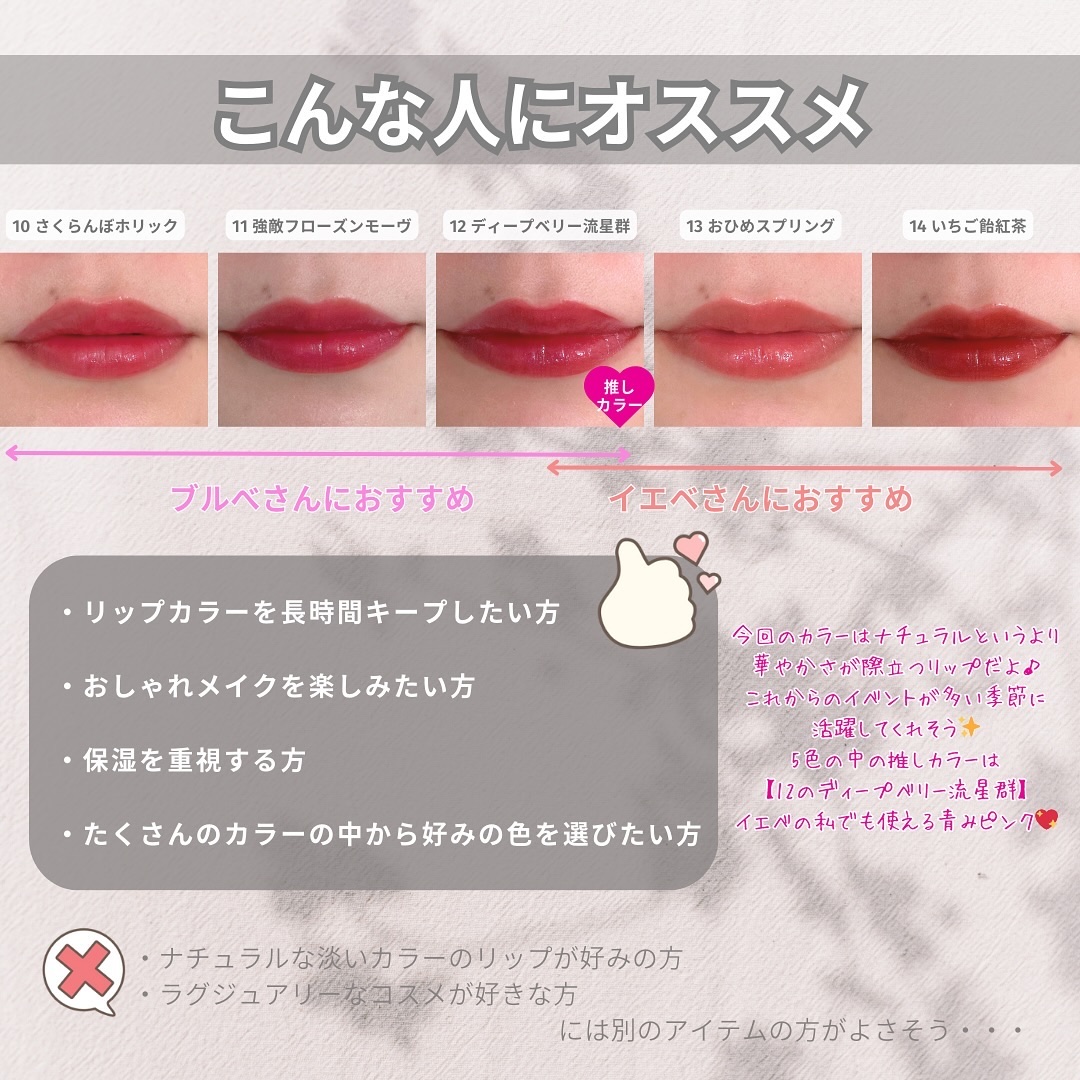 唇に色が密着し、ツヤのあるジェル膜でコートするティントリップ💄💋とにかく色持ちが良い!!! 特にお気に入りなのが14 いちご飴紅茶🍓 イエベさんドンピシャカラーでしょ😍? 塗って約5分後に、ツヤツヤのジェル膜からラメが浮き出てきてキラキラ煌めくの!