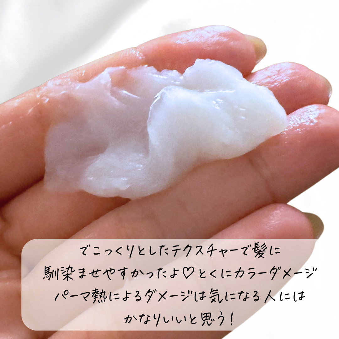 濃厚でちょっともったりしたジェルクリーム。集中ケアしたい時は1-3分置いてから流すと効果アップするそうなので、私は3分置いてます。 髪が柔らかくなって、まとまりやすくなる。指通りがいいサラサラの髪になる。 結構重めのテクスチャーなので、最後の方なかなかチューブから出てこないのでジャータイプの容器だと使いやすいかも?