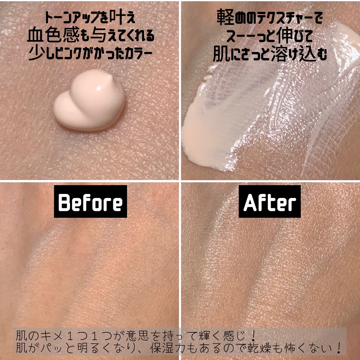 - SPF50+ PA++++ グルタチオン*やナイアシンアミド*が入った、スキンケア効果の高い、化粧下地としても使える日焼け止めです。 さらに、ヒアルロン酸*も入っているので、水分ケアまで可能!冬場でも、長時間乾燥が気になりにくい! スキンケアで肌を潤わしながら、日焼け対策もでき、化粧下地としてベースを整えてくれます。 しっとりとしたテクスチャーですが、仕上がりはベタっとせず、肌の角質層を潤わせるので、メイクの密着力を高め、長時間潤いを感じます。 ほんのりピンクがかった色で、肌に高級感と多幸感を演出してくれます。 *整肌成分