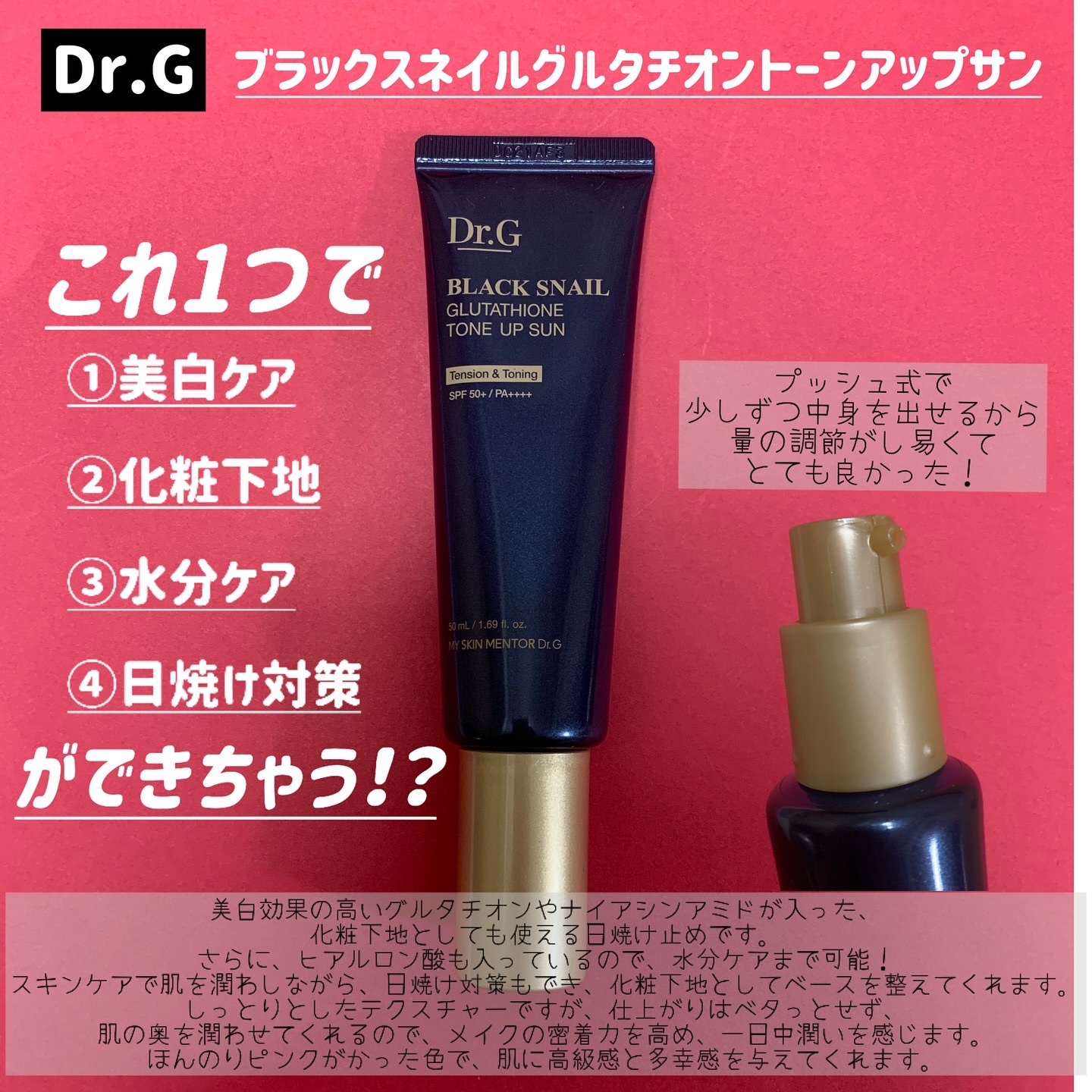 日焼け止めが優秀なドクタージーだけど、その中でもこれはスキンケア効果が高く化粧下地としても使える日焼け止め🧴 美白効果の高いグルタチオンやナイアシンアミド ヒアルロン酸も入ってる! ほんのりピンクがかった色は自然なトーンアップと多幸感💞