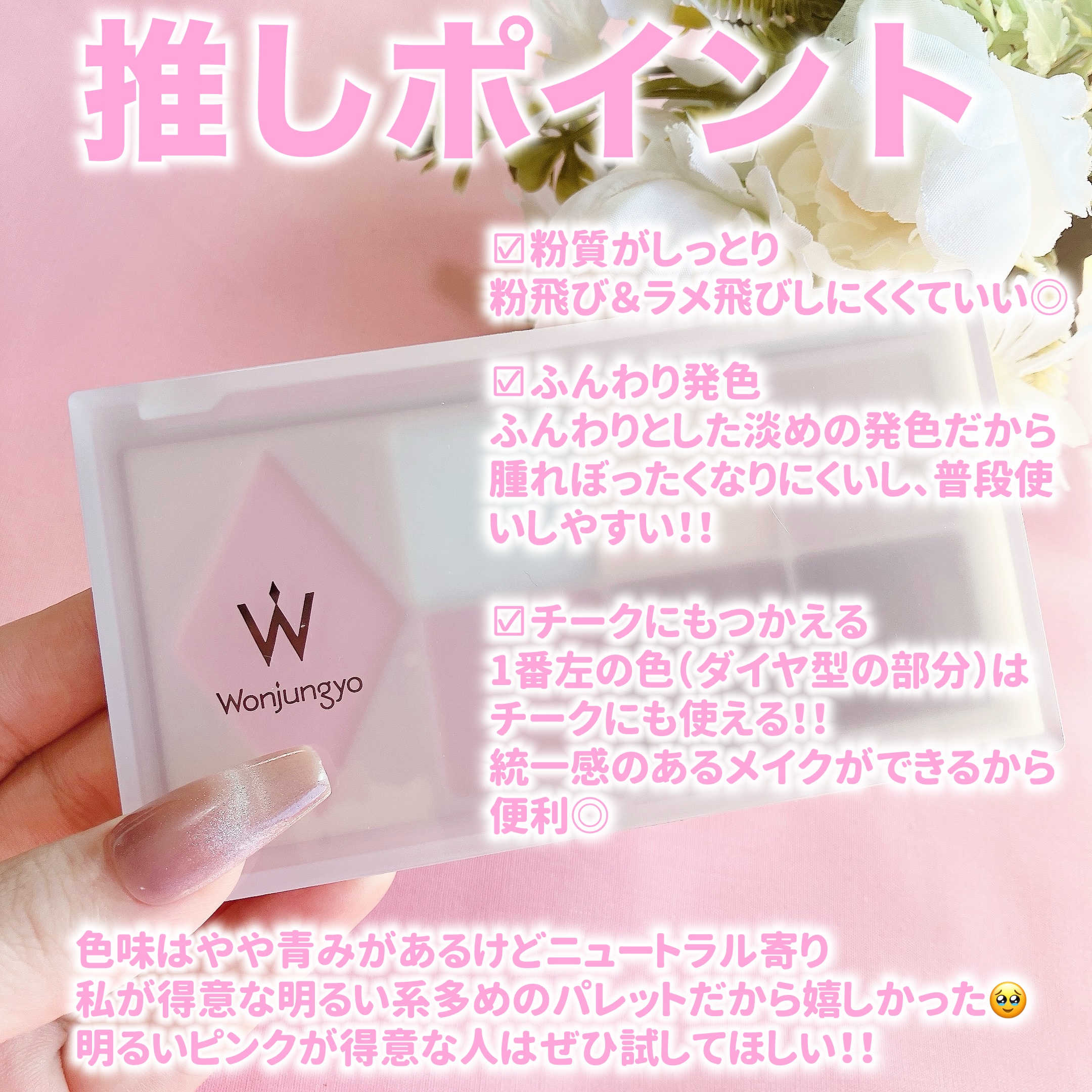 念願のWonjungyo先生のオススメもされていた、アイパレット🌹 異なる3つの質感をこよ1パレットで✨ ふんわりマット、きらめきグリッター、繊細シマーを使いこなして、柔らかな印象や濡れたような輝き、メイクで目元にツヤと立体感を💖 涙袋にも使えるカラー、繊細グリッターだからこのアイパレット1つで目元が仕上がる‼️