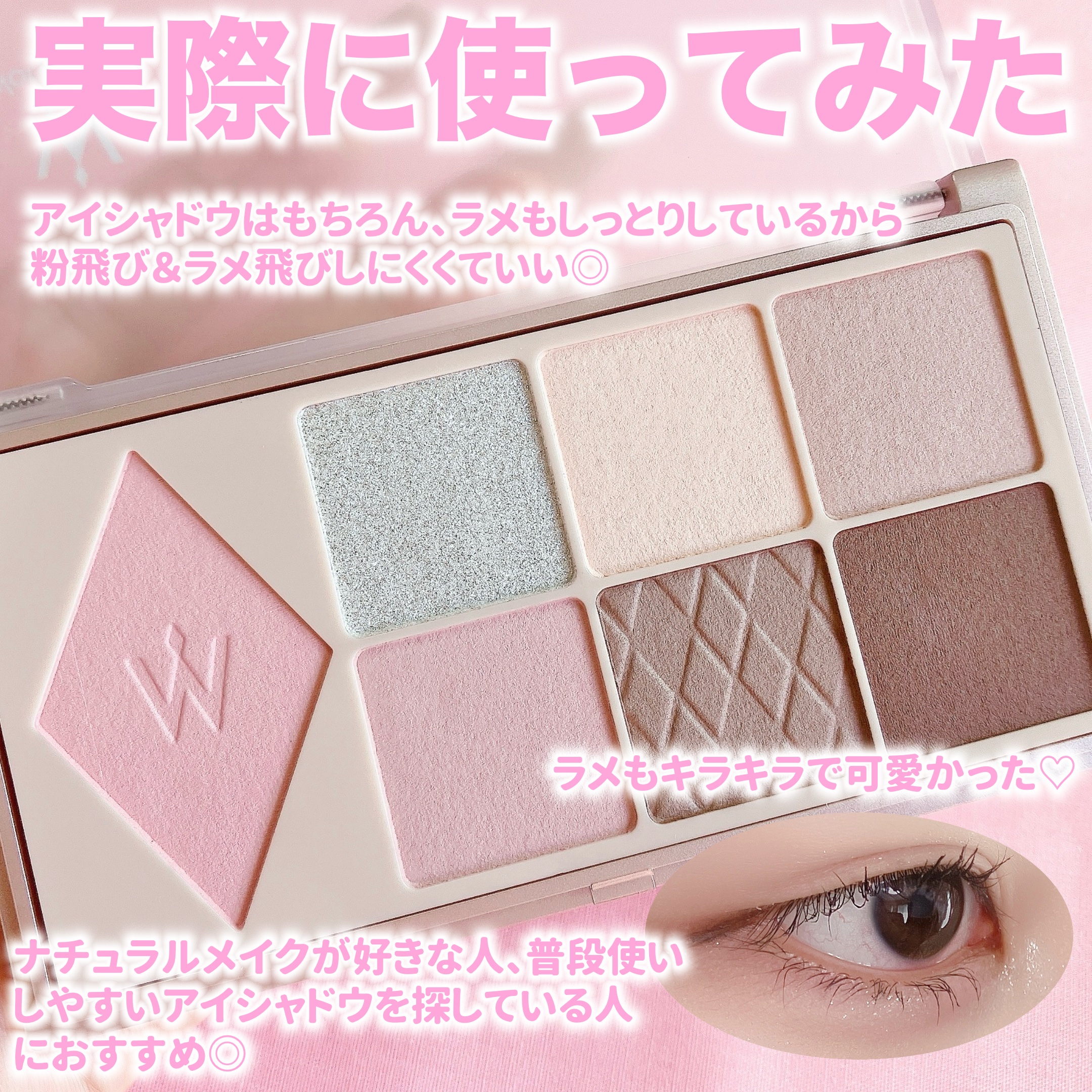 人気の理由がよくわかった🙌🏻 今回使ったのは01ソフトモーヴピンク 色味はやや青みがあるけどニュートラル寄り。 アイシャドウはもちろん、ラメもしっとりしているから粉飛び&ラメ飛びしにくくていい◎ 腫れぼったく見えにくい&統一感のあるメイクをしやすいから初心者さんはもちろん、色んな人におすすめしたい🤍