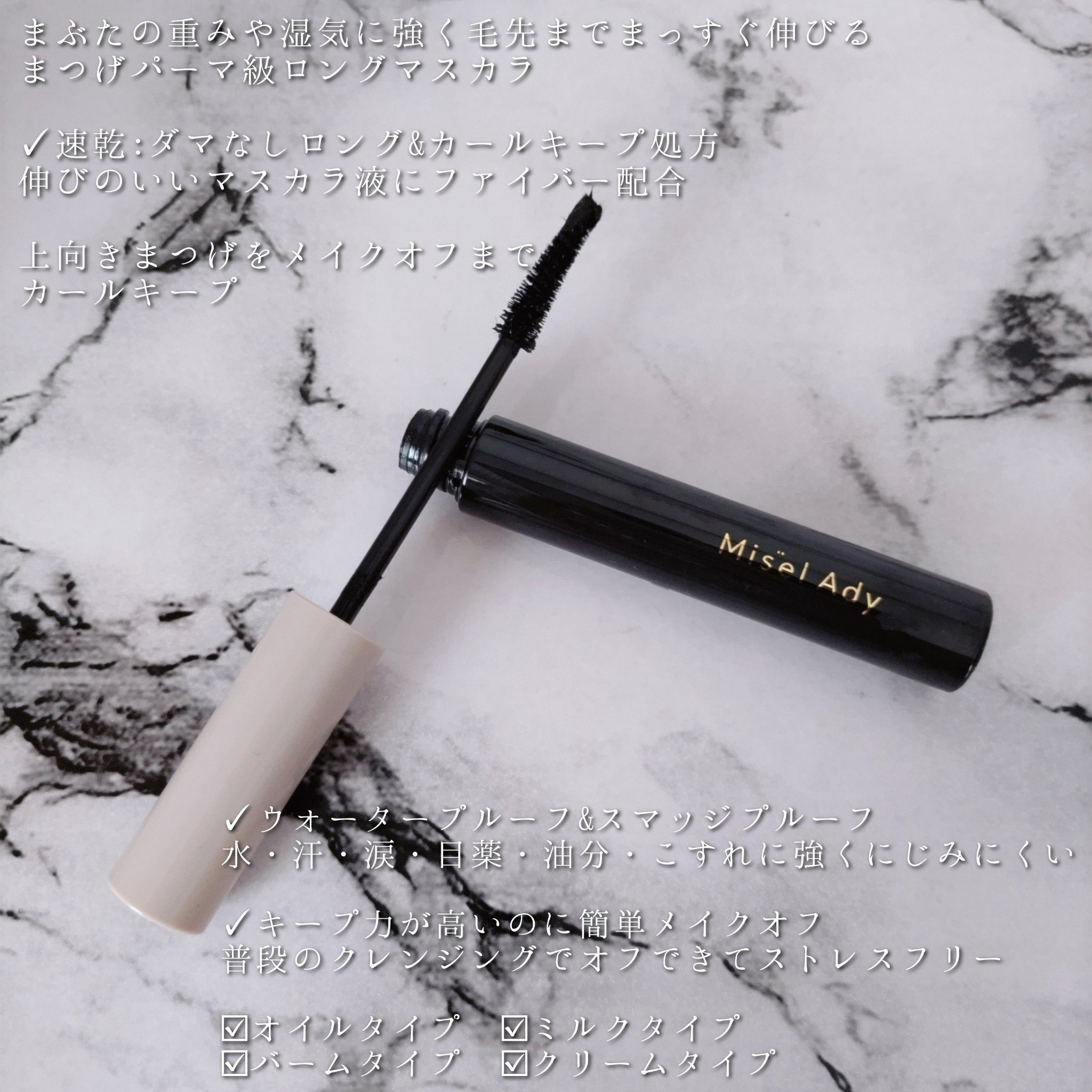 - まつげパーマ級のカールキープ力があるダマになりにくいロングマスカラ。 まぶたの重み・湿気に強く、メイクオフまで上向きまつげをキープ。 ●ウォータープルーフ&スマッジプルーフ 水/汗/涙/目薬/油分/こすれに強くにじみにくい ●ダマを防いだロングまつげが作れるこだわりのブラシ ☑しごき不要 ☑ほどよい束感 ☑上向きカール ●キープ力が高いのに簡単メイクオフ 普段のクレンジングでオフできてストレスフリーな使用感 ☑オイルタイプ☑ミルクタイプ☑バームタイプ☑クリームタイプ ●まつげに潤いを与える海藻エキス(*)配合 *アスコフィルムノドスム/ヒバマタ/ヒジキ/トロロコンブ/レソニアニグレスセンス/ミツイシコンブ/リシリコンブ/ワカメエキス