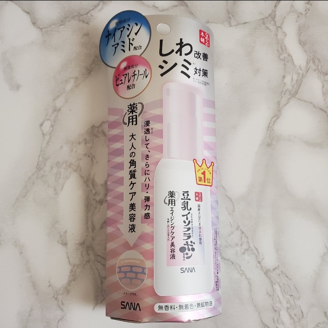 - 【医薬部外品】 浸透*1して、ハリ・弾力感 大人の角質ケア美容液 無香料・無着色・無鉱物油 豆乳発酵液含有の薬用エイジングケア*2美容液 しわ改善&シミ対策できる豆乳の角質ケア美容液 シミ対策:メラニンの生成を抑え、シミ・そばかすを防ぐ 有効成分ナイアシンアミドがお肌の奥まで届く! 角質にアプローチしながら、ハリ・透明感のある素肌へ。 乾燥が気になる大人のお肌に 乳酸(保湿成分):うるおいで角層をやわらかくなめらかに整えます。 豆乳発酵液(保湿成分):弾力感・うるおいを与え、ふっくらとした質感のお肌に。 ピュアレチノール(保湿成分):ビタミンAの一種で、ハリのあるお肌に。 ナイアシンアミド(有効成分):しわを改善し、メラニンの生成を抑え、シミ・そばかすを防ぎます。 ごわつきが気になるときに・・・コットン使い! 洗顔後、化粧水の前にコットンに適量(3プッシュ程度)をとり、お顔全体にやさしくくるくると広げてなじませてください。 つるんとハリ・透明感! 国産丸大豆「たまほまれ」使用 なめらか本舗「エイジングケアライン」オリジナルの豆乳発酵液(保湿成分)は、国内で栽培された大豆「たまほまれ」を丸ごと使用して作られています。 なめらか濃縮製法でつくるオリジナルの豆乳発酵液 豆乳発酵液に使用している大豆は、遺伝子組換えなし大豆を使用しています。 ●パッチテスト済み ●アレルギーテスト済み (すべての方に皮フ刺激やアレルギーが起きないわけではありません。) *1角層まで *2年齢に応じたお手入れ