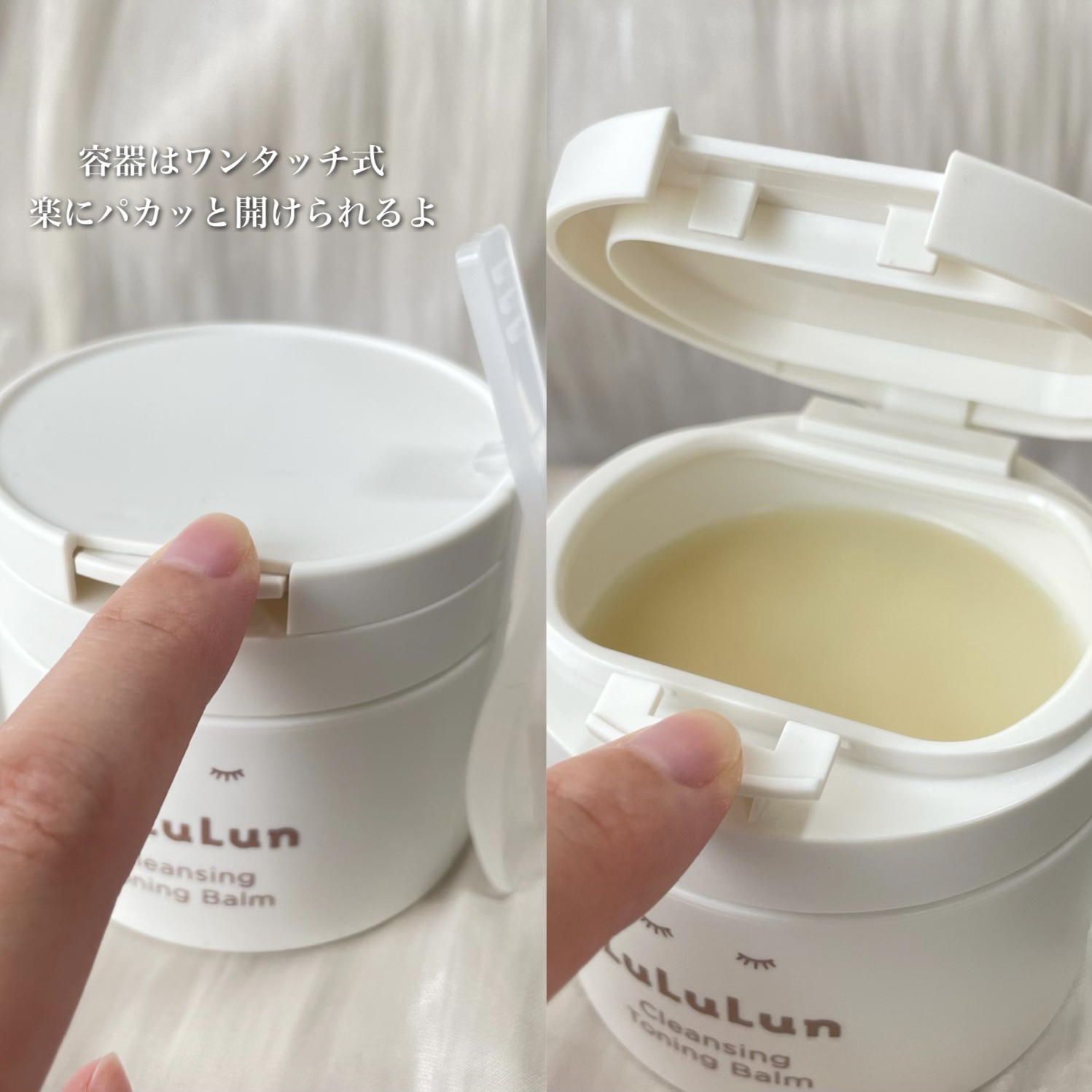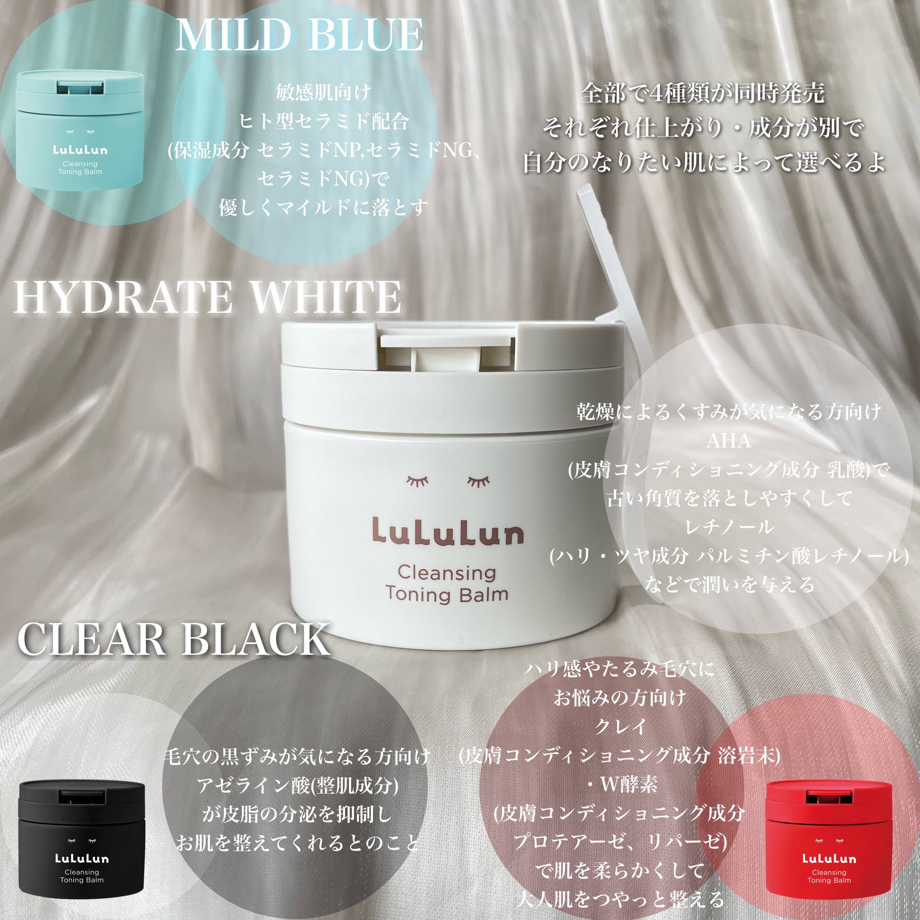 お肌にのせると体温ですぐにトロけるバーム🤍 メイクに馴染ませたあと、水で乳化させることで素早くキレイにメイクを落とすことができます! 使用後のつっぱり感は無く、しっとりと落としてくれますよ✨ しかもマツエクOK、W洗顔不要は嬉しい☺️ 今回使用した白のトーニングバームは、くすみケア、乾燥ケアしたい方におすすめ🤍 ルルルンのクレンジングバームは全部で4種類!