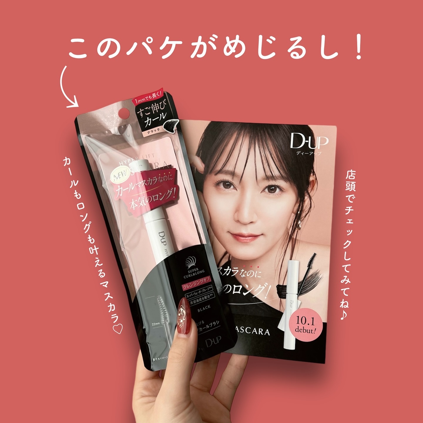 - 2024年10月1日より全国のバラエティショップ、ドラッグストア、公式オンラインショップ(https://store.d-up.co.jp/)にて発売いたします。 『ハイパーリフトマスカラ』は、“カールマスカラで本気のロング”をコンセプトに、ディーアップ史上最強のカールキープ力と驚きの長さを追求した新しいマスカラです。 ■カールキープ力とロング感の両立 カールキープ力の高いマスカラは、通常ワックスや被膜材でカールをキープしますが、同時に「ロング感」や「ダマの無い仕上がり」を両立させることは難しいとされてきました。ハイパーリフトマスカラは、あと1㎜長く、もっとなめらかにするための改良を重ね、「カールキープ力」と「ロング」どちらも限界レベルまで欲張った新処方です。 ■1㎜でも長く!「すご伸びカール」 ロングの秘密は、なめらかで“伸び感”のあるカール液。ファイバーを包み込みながら素早く毛先まで絡み、美しくスッと長いまつげを実現します。 さらに長さを出すため「まつげの根元」にも着目し、生え際から持ち上げて伸ばす、コンパクトなリフトアップカールブラシを新たに採用しました。 『ハイパーリフトマスカラ』で、想像を超える“新次元の上向きまつげ”を体験してください。