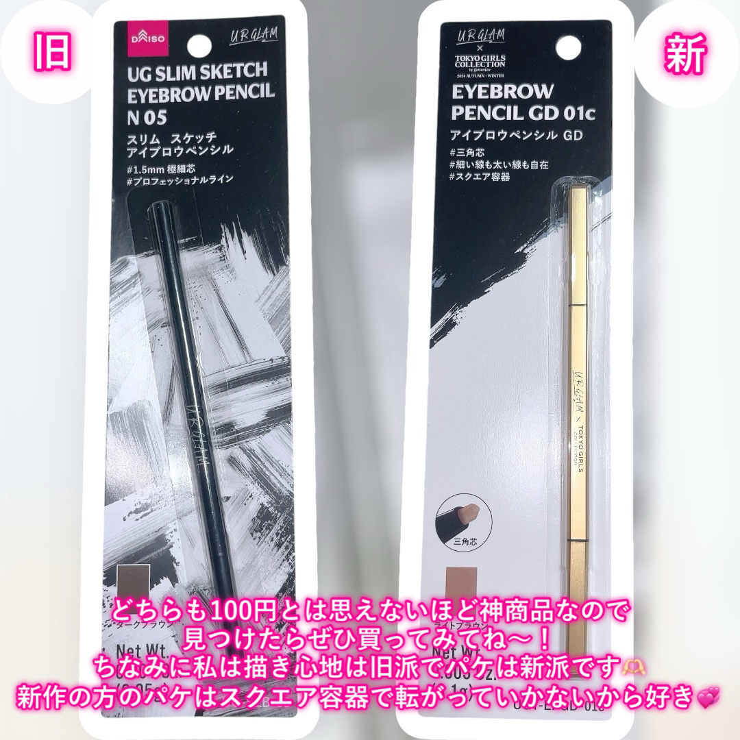 コスパ良し、発色良しのアイブロウペンシル! ずっとUGのを使っていて、新しくでたUGTも試してみたので比較しました! UGT アイブロウペンシル GD 01cはUGと比べると芯は太めで、しっかり発色してくれます! また折れにくいです🙆♀️ 100均とは言えど、発色も持ちもいいのでおすすめです!