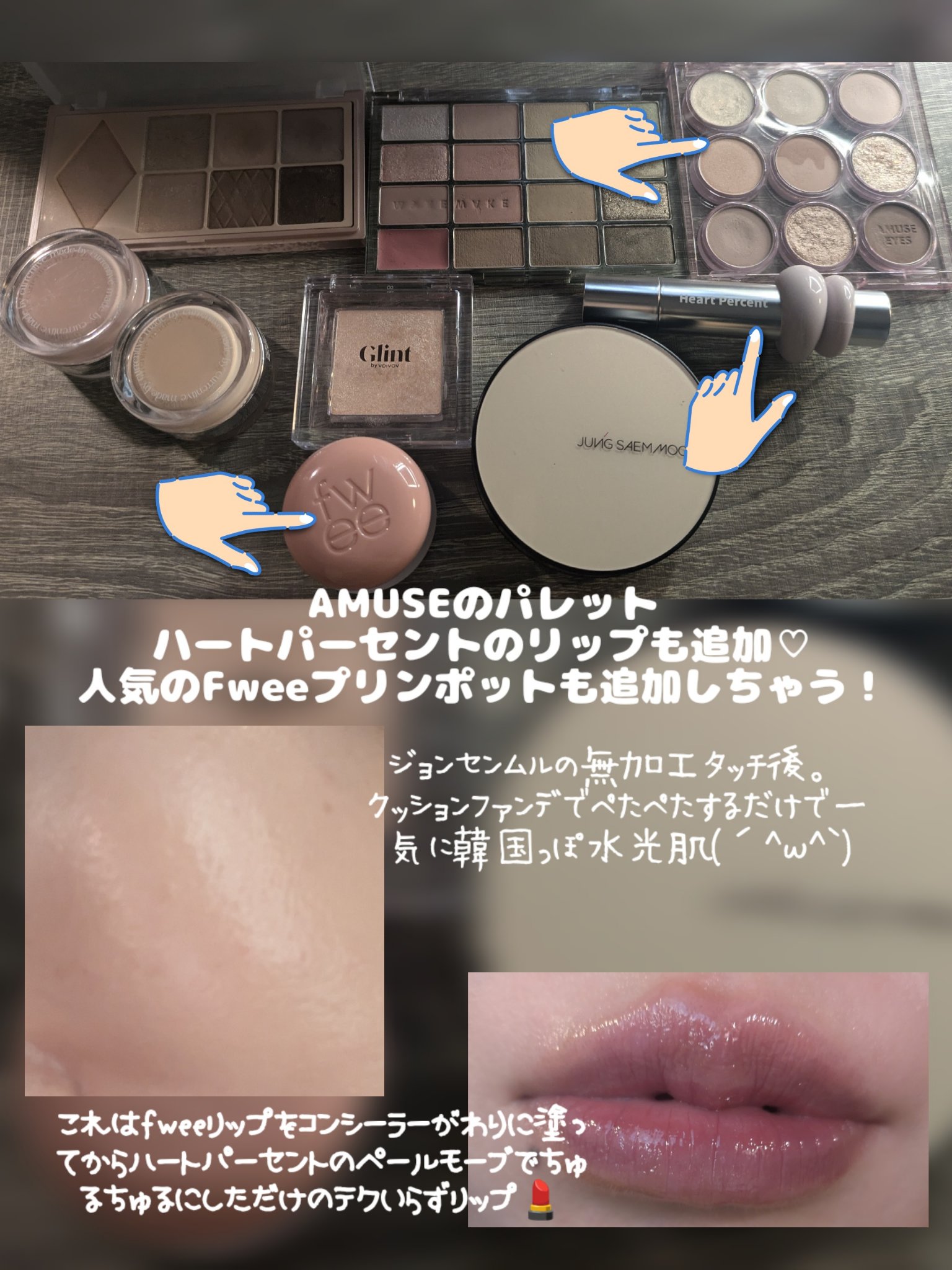 はじめまして、すべてのパーツにうるうるちゅるちゅる感があって素敵なメイクです🥺 特にHeart Percent のティントの、ブドウ1粒を水飴にした感があって最高ですね🍇