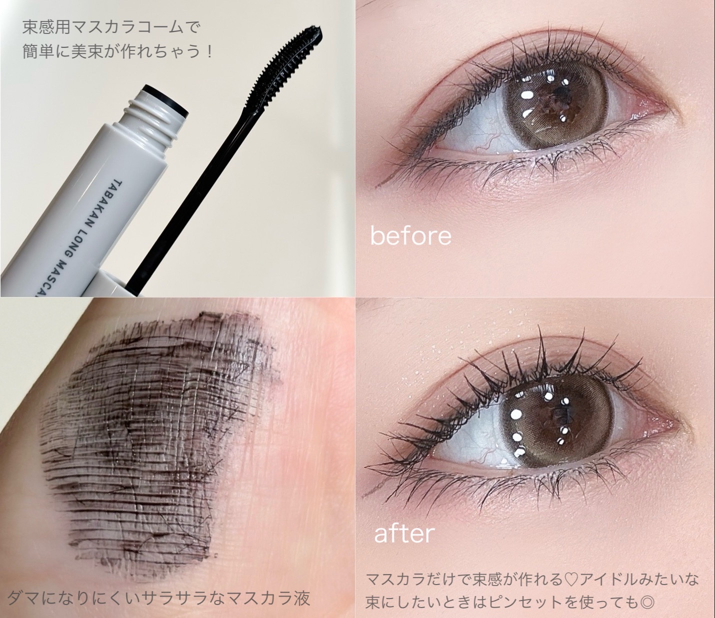 - 束感×ロング×カールが叶う、ピンセットいらずで簡単に束感まつげができるコームマスカラ。 ダマになりにくいミックスファイバー配合でするんと伸びる。 カールキープワックス配合で長時間まつげ上向き。