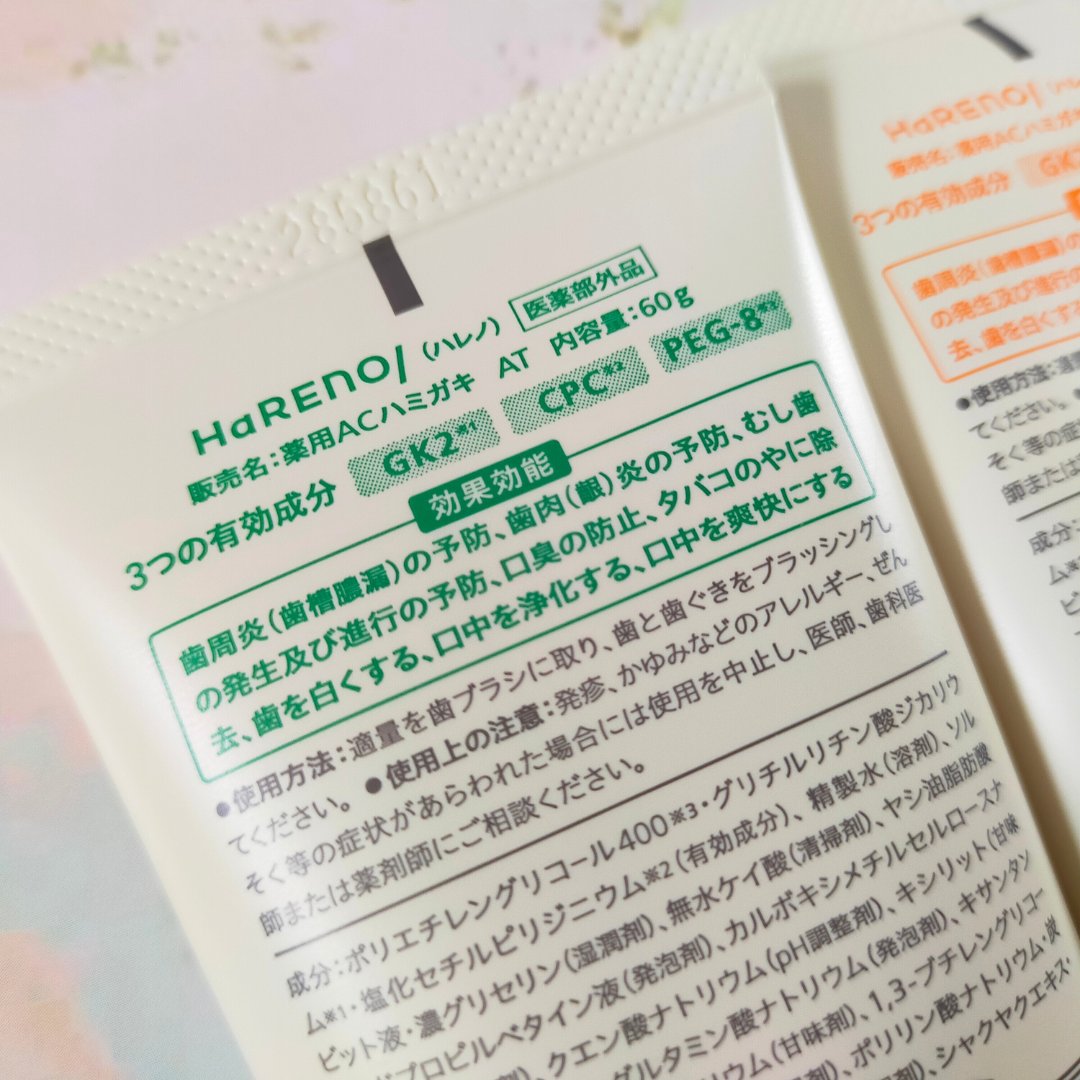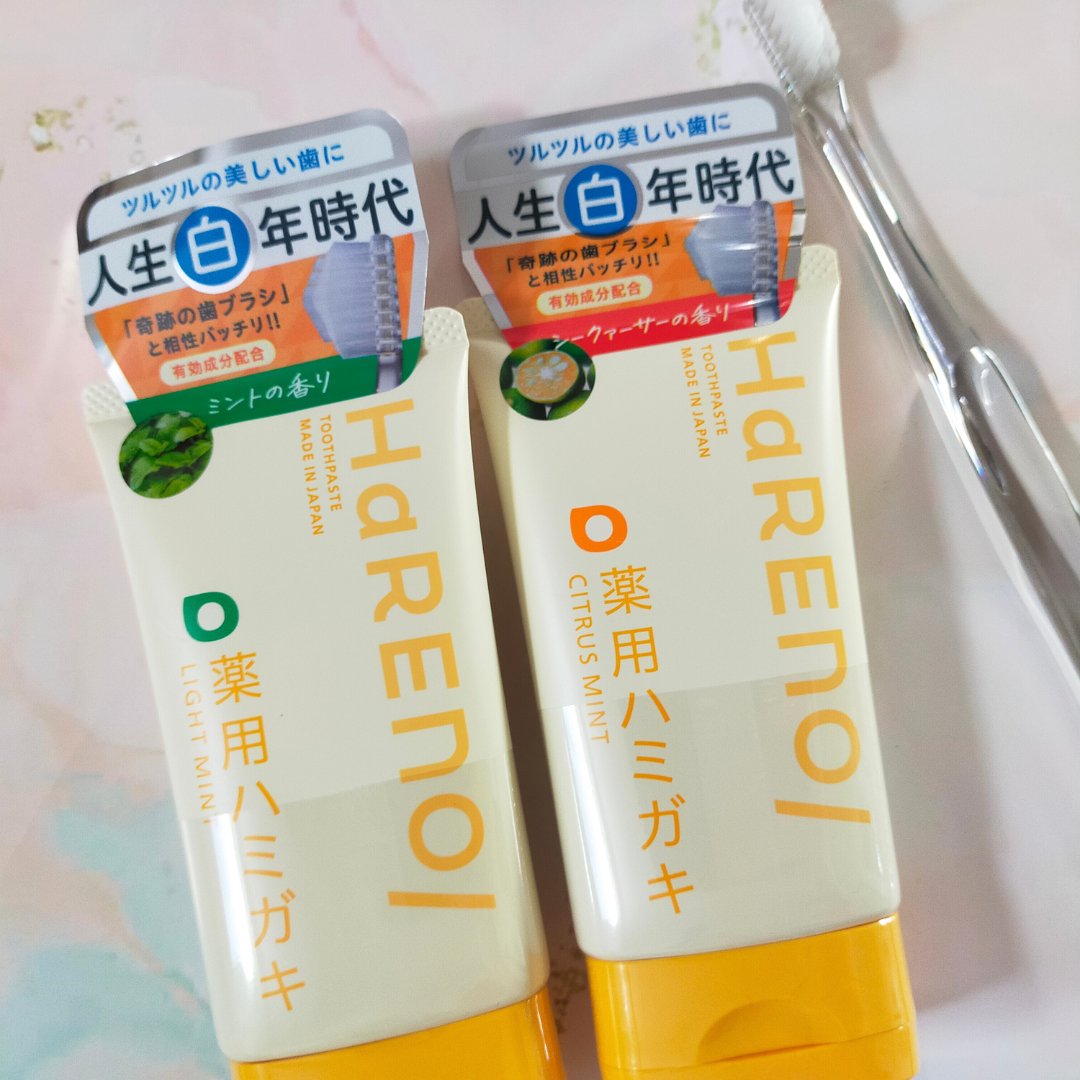 HaRENO薬用ハミガキ(医薬部外品)ハンドクリームみたいな容器のかわいい歯磨き粉💛シトラスミントはシークァーサーの香り。苦味はなく甘めの柑橘フレーバー。クリーミーバブル洗浄とのことですが泡がたくさん出るというよりはキメが細かくて心地よい泡立...