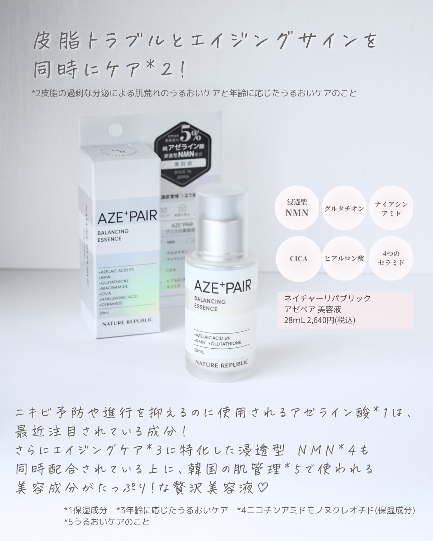 *Thankyou*ネイチャーリパブリック様よりアゼペアをいただきました。日本にいながら自宅で韓国の肌管理*体験できる美容液です。*うるおいケアのこと話題の二大成分!高純度アゼライン酸*1+NMN*2配合!!いつものスキンケアにプラスするだけ...