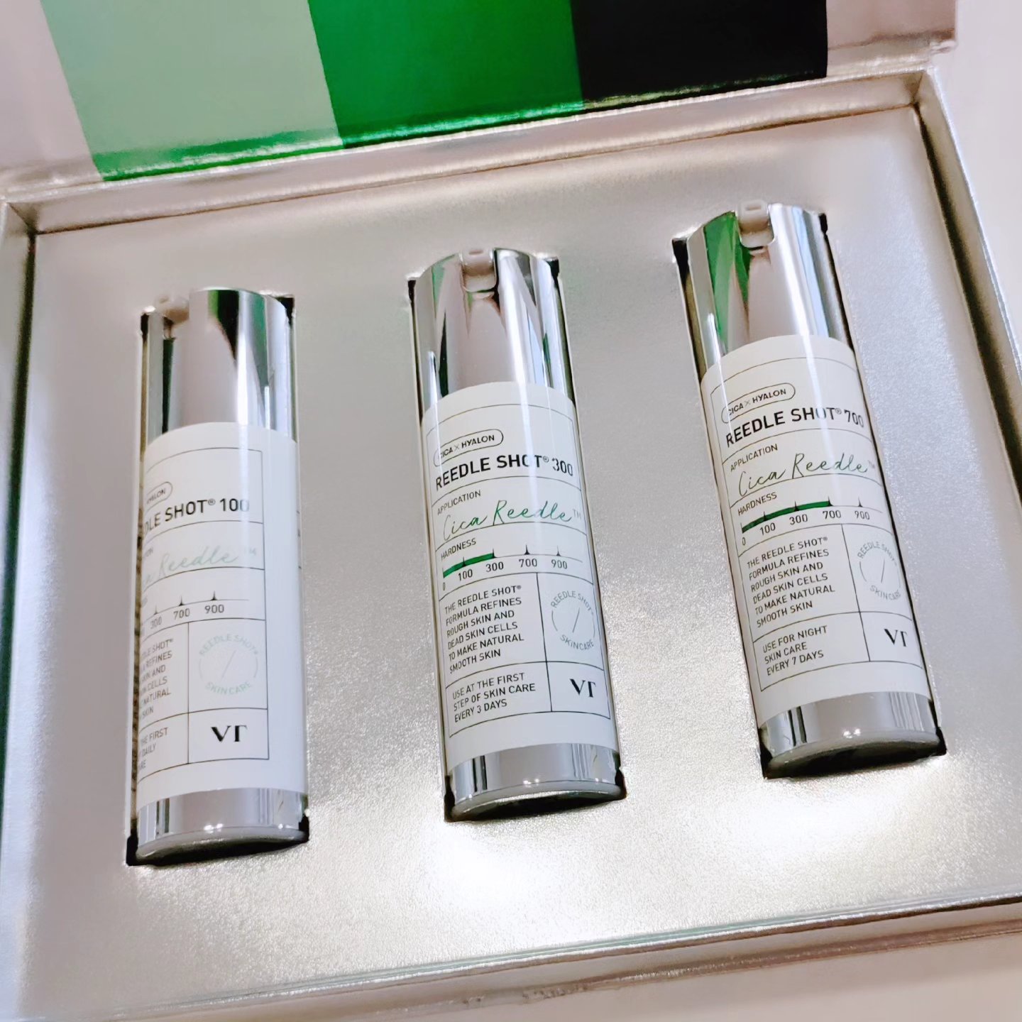 リードルショットがなぜおススメなのかというと 最初に塗ることでそのあとのスキンケアの浸透率を高め効果を引き出すことができる点です🫶🏻✨ 天然マイクロニードル(美容針)が美容成分を肌の奥まで届ける道を作ります🪡 現在「50・100・300・700・1000・1300」の6種類があり 数字が大きくなると天然マイクロニードル(美容針)の配合量が増えより浸透率や効果が高まりますが、肌への刺激も強くなります⚡️