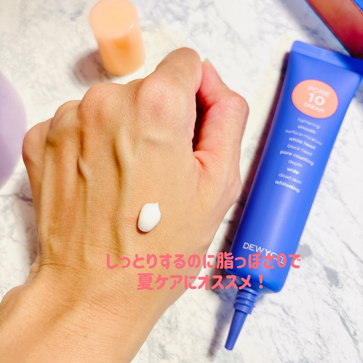 毛穴ケアだけでなく角質ケア、肌の水分補給、肌鎮静も!なんと70枚も入っているんです✨ ポアテンクリームはLIPSの『【2024年最新】韓国毛穴レススキンケア特集!』でも紹介された注目アイテム!毛穴のタイトニング効果に加え、プライマーと肌の水分補給も🌼 クリームは柔らかいけど濃密でしっとり系!毛穴の気になる部分に塗ってからファンデするのがお気に入り💛