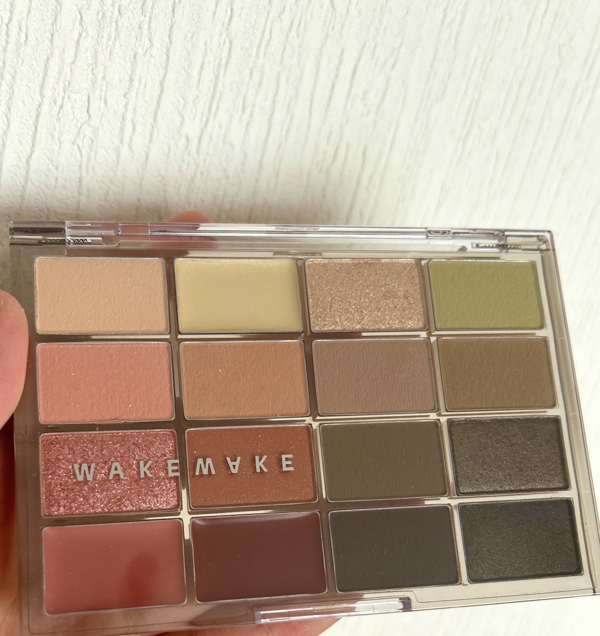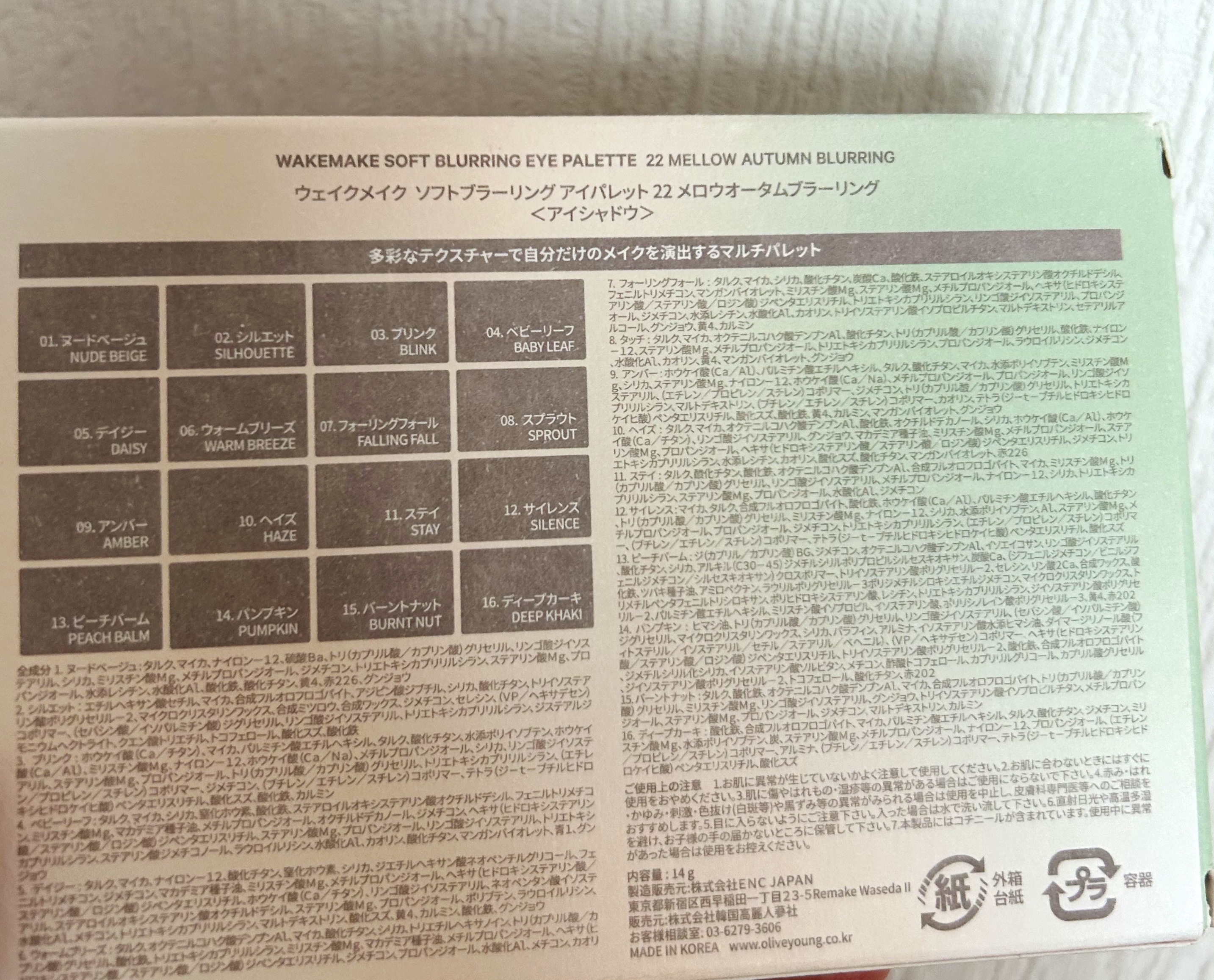 WAKEMAKEのソフトブラーリングアイパレットは、マット・パール・グリッターなど質感の異なる全16色のカラーが入ったアイパレット✨ 22 メロウオータムブラーリングのカラーは、深みのあるカラーにアクセントのあるスモーキーカーキ、暖かみのあるゴールディッシュイエローを感じるディープブラウン&スモーキーメイクルックだそうです🫠🌟 服や気分に合わせて色んなメイクができるのでおすすめです❣️