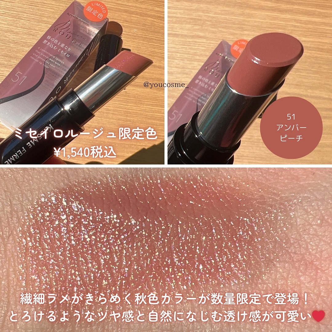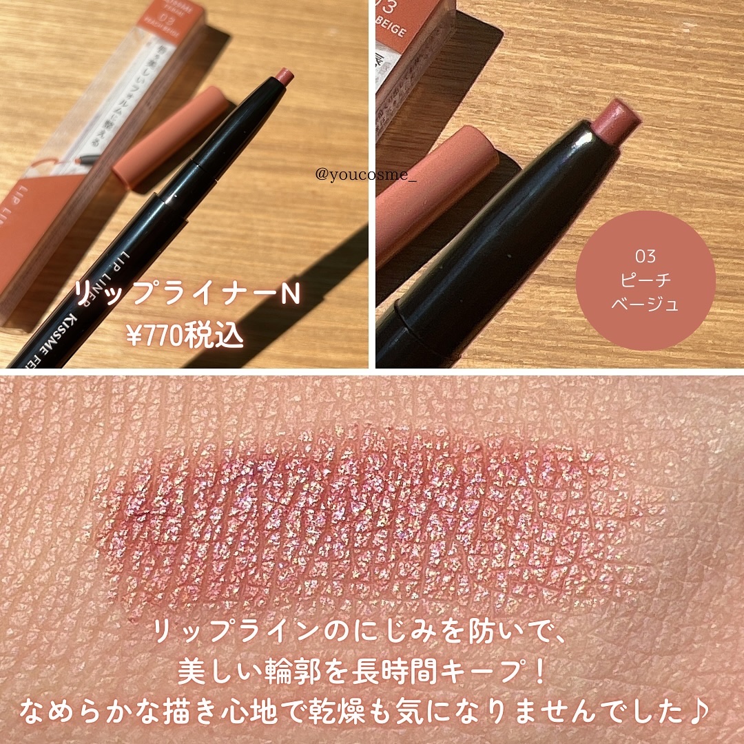 51アンバーピーチ(限定色)はとろけるスイーツのような甘さを含んだ、微細ラメ入りの上品なヌーディーカラー🥮☕️ 唇に乗せた瞬間にスルーって溶けていく滑らかな塗り心地が特徴♡ リップライナーは固そうってイメージがありましたが、キスミーのライナーはスルスルなめらかな書き心地でびっくり😳