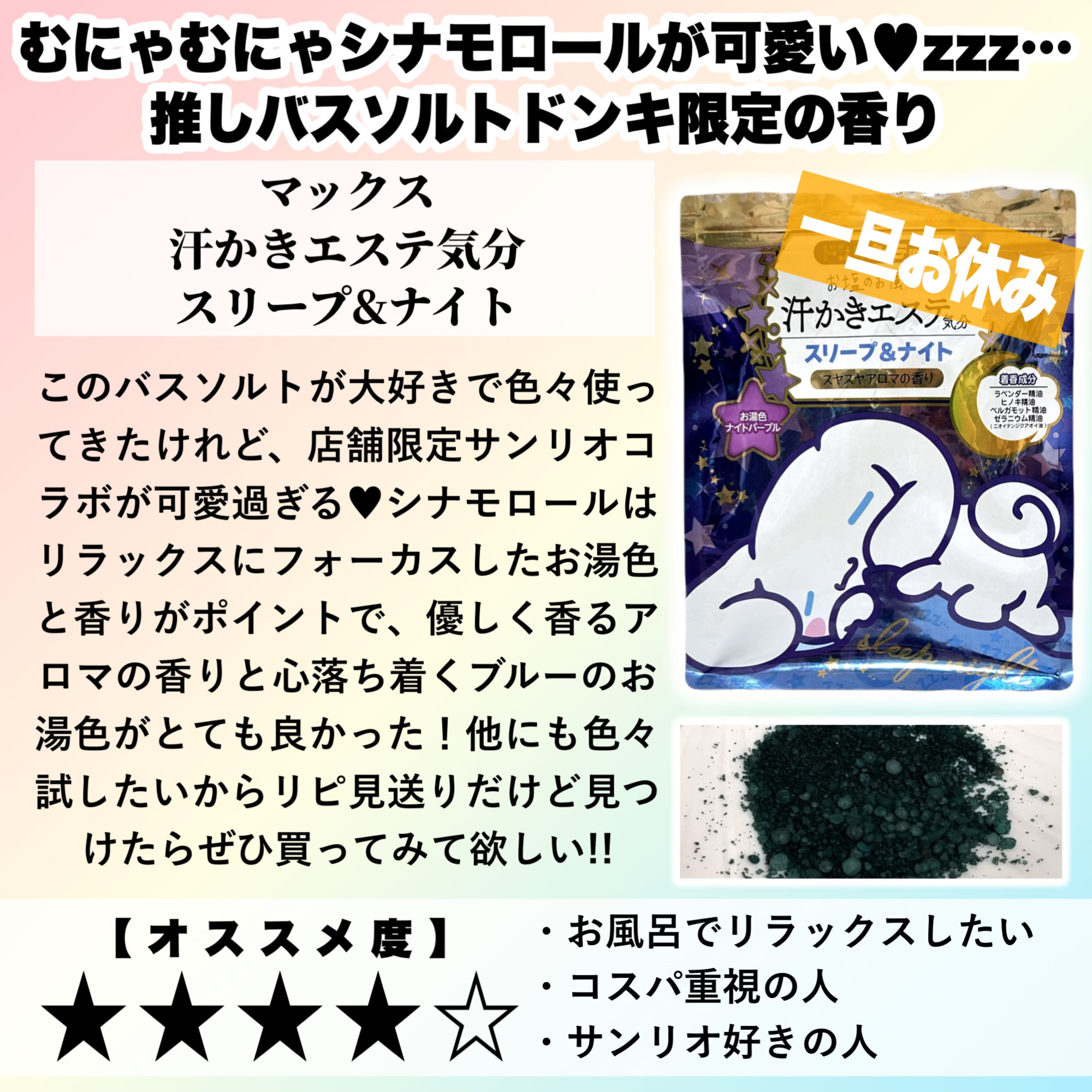 | ボディケアランキング第134位 | それぞれ香りが良くって、あと湯色もしっかり出るので温泉気分を堪能できるのがお気に入り♡ | 詳細を見る | |