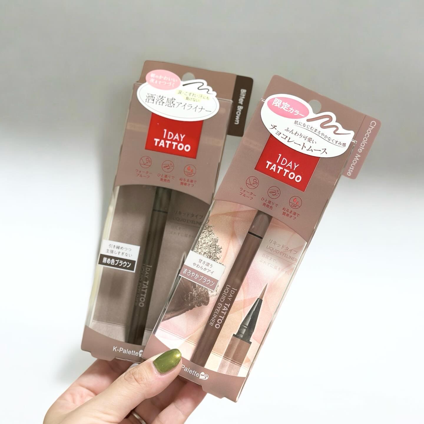 - 『色味』『洒落感』にこだわった新生!『K-パレット 1DAY TATTOO リキッドアイライナー』が登場! 【商品特徴】 1色味の「使いやすさ」と「洒落感」を両立したオリジナルの「スキントーン・カラー」 2メイクや肌トーンに馴染みやすいカラーだから抜け感が生まれ、垢抜け顔に♫ 3「ハイブリッドTATTOO FILM」で朝のキレイを崩さない 4オリジナル「ブレンド筆」で感動の描き心地 5 7種の美容保湿成分配合 6ぬるま湯で簡単オフ! 7色素沈着しにくい! 8速乾・にじみにくい