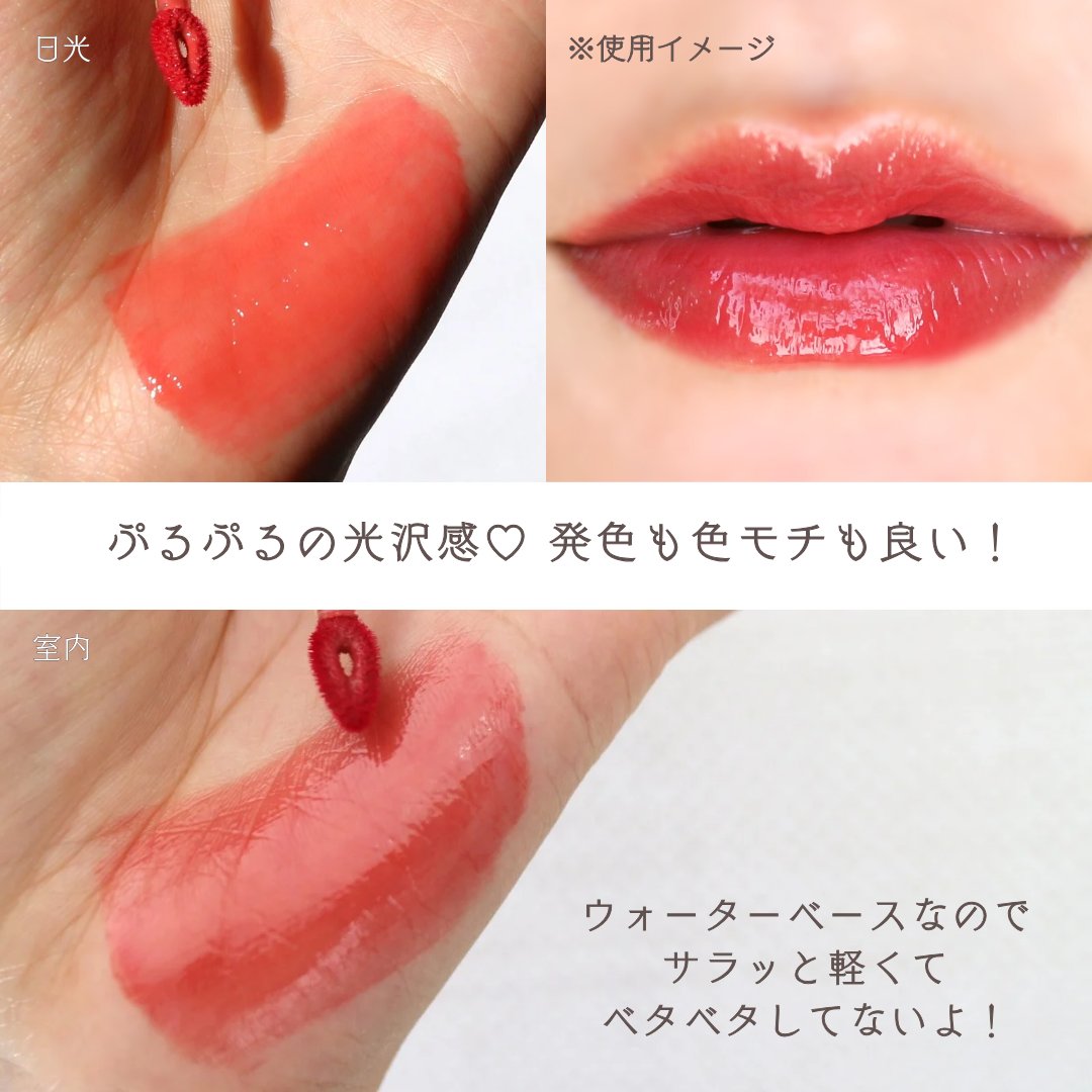 ふわふわチップで液たっぷり取れて ササッと塗って馴染むのを待つと めっちゃツヤツヤ✨ みずみずしいミラーリップだよ😍 カラーは今回5色使ったんだけど、 すべての色が発色良いし、めちゃくちゃ可愛い🥹✨ ティントなのでティッシュオフ後の色残りも有り◎