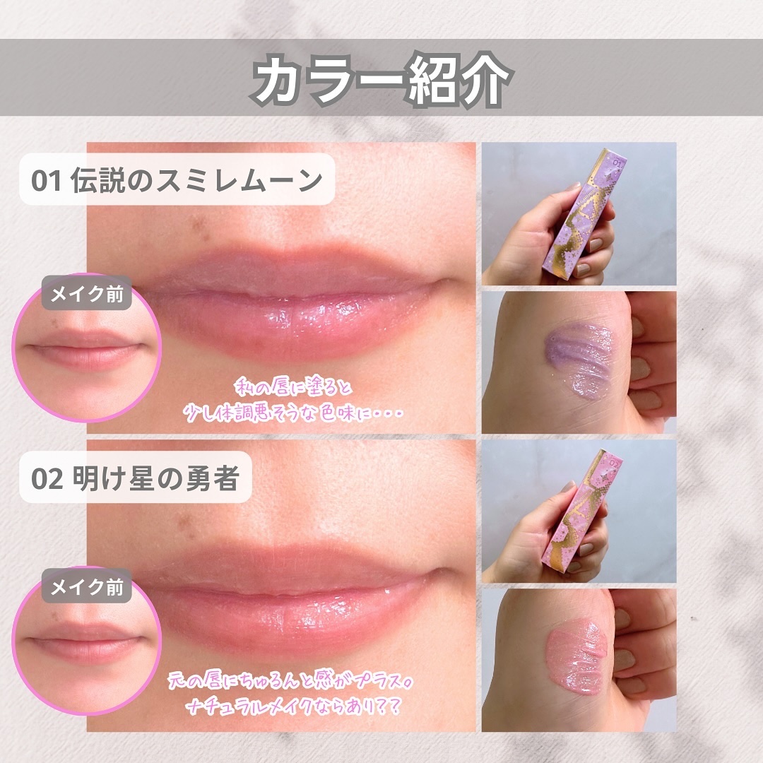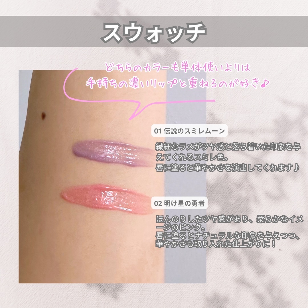 | 指で軽く触るとジェル膜を感じられますし、ツヤツヤぷるぷるのリップに仕上がります! | 詳細を見る | ||