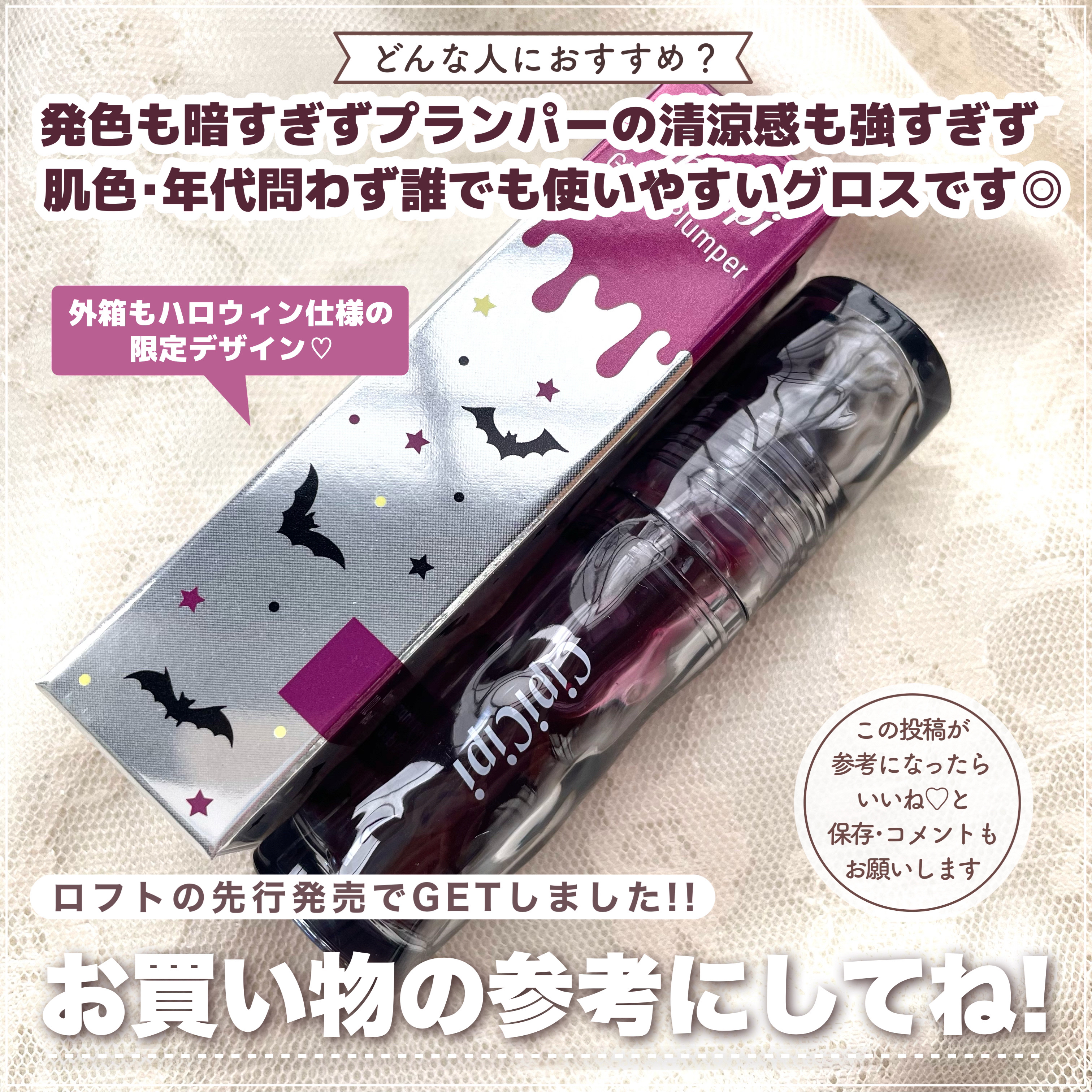 大人気リッププランパーにハロウィン初の限定色が仲間入りしますよ〜🫶🏻✨ 102 ヴァンパイアレッドは吸血鬼をイメージしたまるで血のようなディープレッドカラー。実際使ってみたらそこまで深みが強いわけではなく、おいしそうなブドウみたいな色味でかわいい🍇💕 既存01と同じくベリーバニラの香りつき。甘い香りがお好きな方に◎