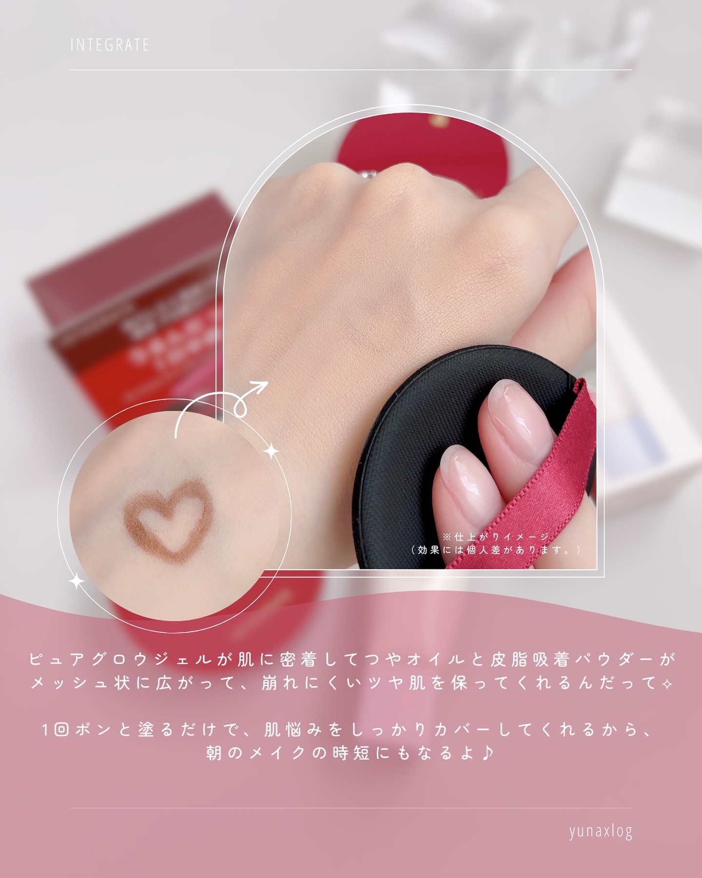 瞬間カバーするのに厚塗り感ナシ! うるんだつや肌、1日中続くクッションファンデーション カバー力高め! サッと塗るだけで薄いシミや毛穴はちゃんとカバーしてくれるし崩れにくかった! インテグレートならではの赤パケ インテグレートっていえば赤だよね!綺麗な赤のパケ❤️