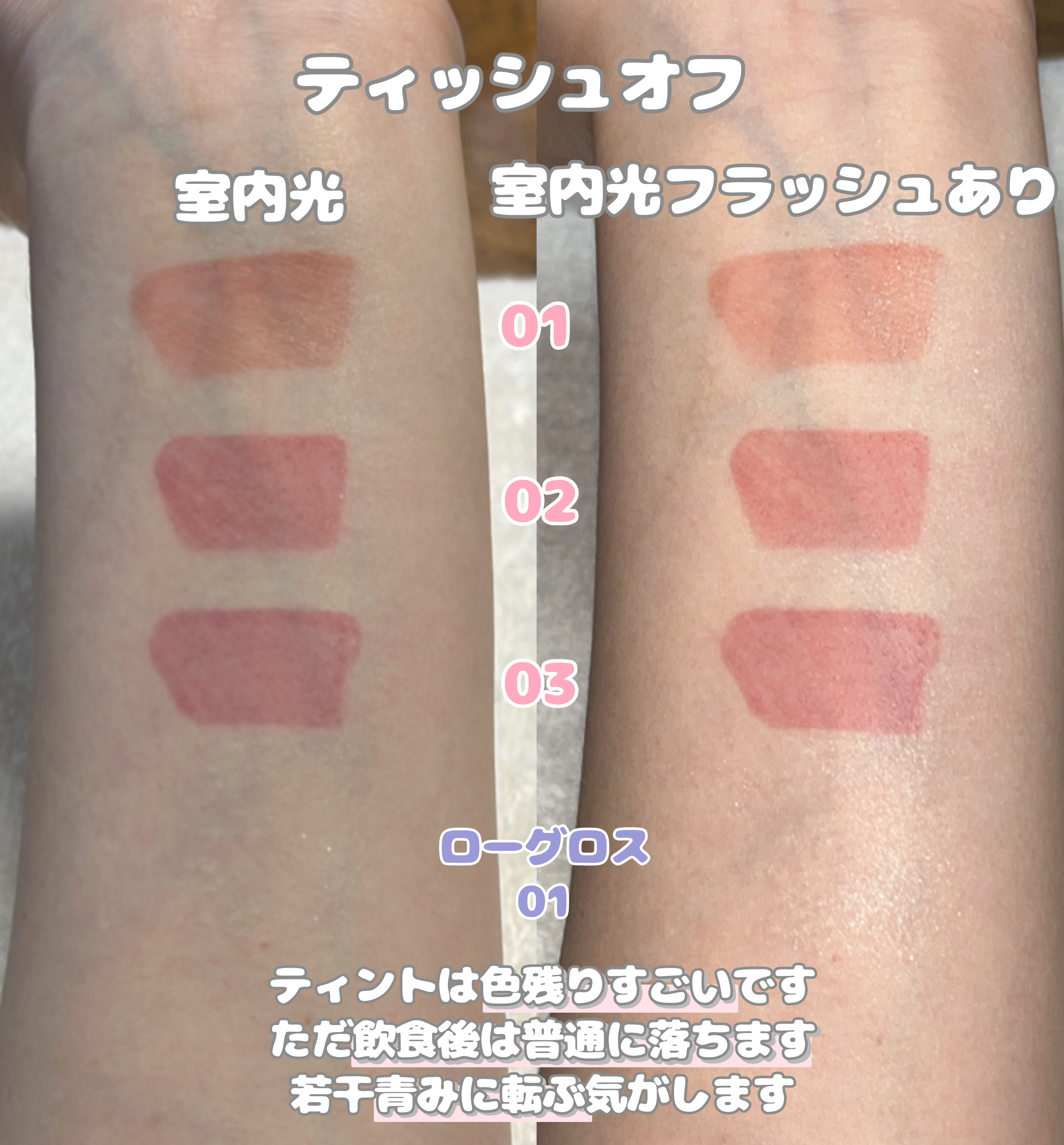 みずみずしくて軽いつけ心地。強めにティッシュオフしても色も残ってる✨️ ミニサイズだから使い切れそうだし持ち歩きにも良い🙆♀️ その日のメイクや気分に合わせて使えるのでミニサイズおすすめです✨