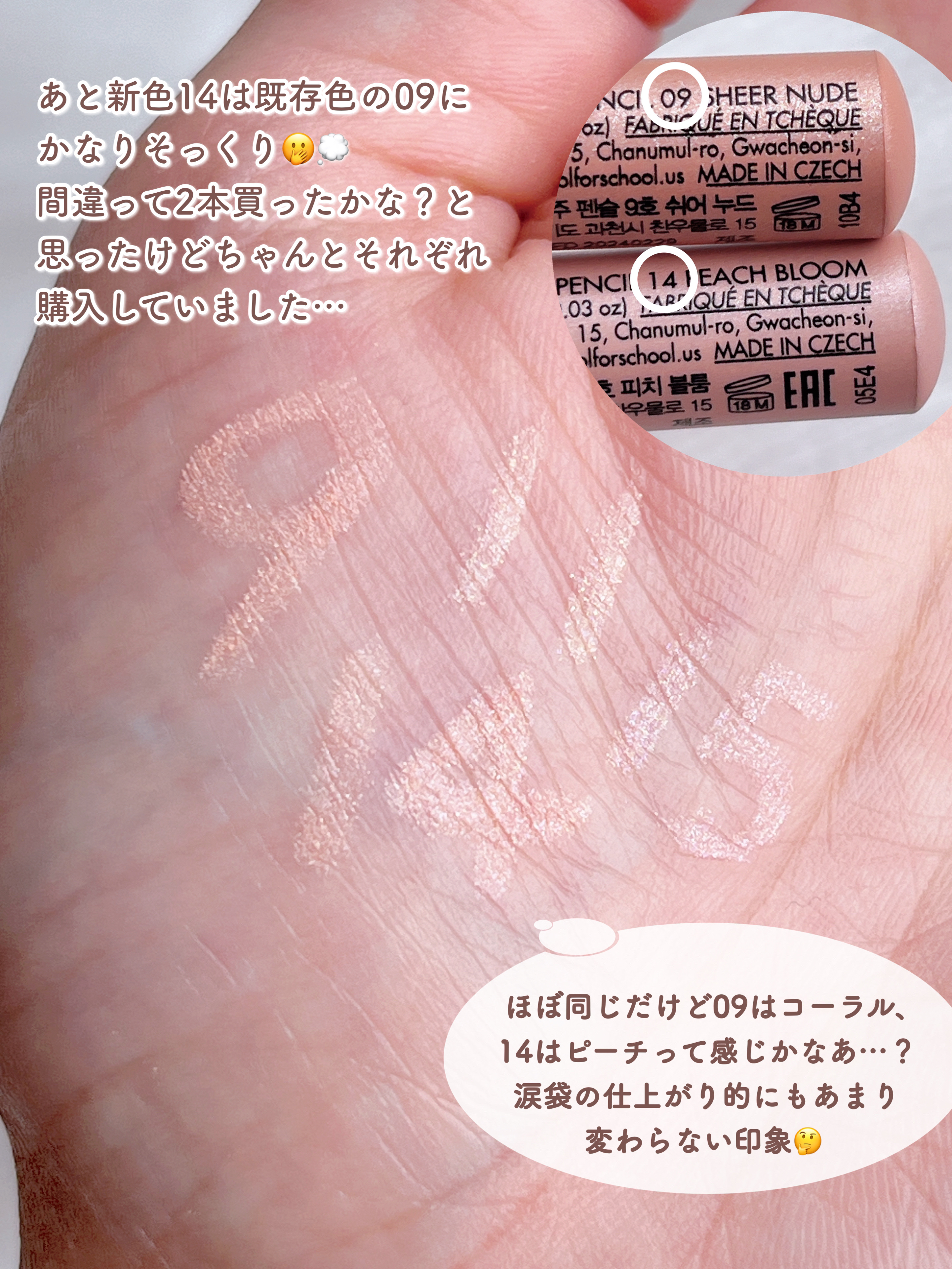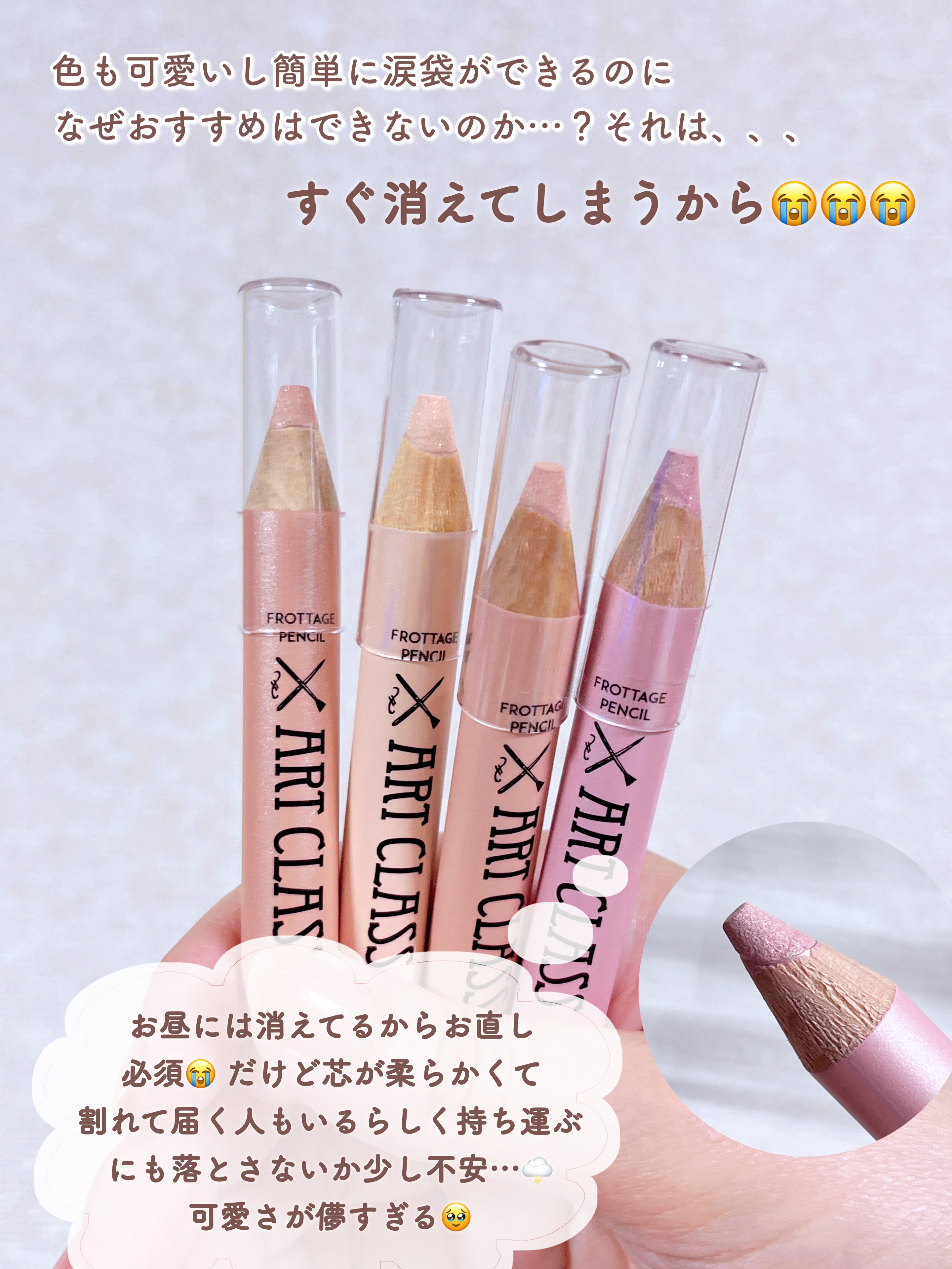 涙袋に使用すると、立体感が出て簡単にぷっくりしてとても可愛い!! かなり描きやすい! 少しの力でスルスル〜っと描けちゃいます。粒子が細かくて柔らかい! 他の色も集めたくなっちゃうようなペンシル。