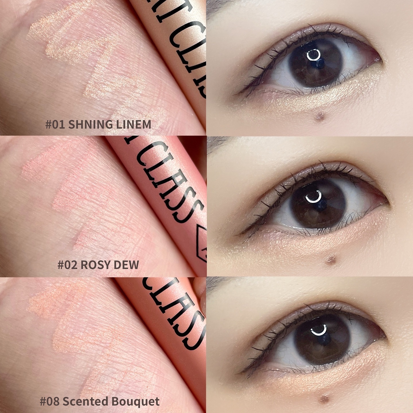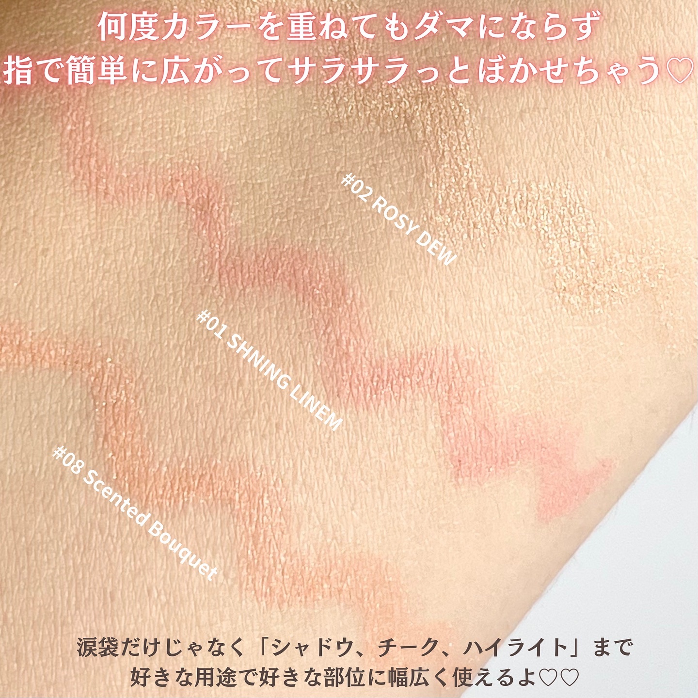 アイシャドウには各色に番号が刻印されているので、 番号順にまぶたにアイシャドウを乗せていくだけで 簡単にグラデーションが完成♡ 柔らかくしっとりした粉質なのでまぶたにぴったり密着して、粉飛びやラメ落ちしにくいのもポイント◎ チークはアイシャドウの色にあわせたカラーなので メイクに統一感を持たせてくれて嬉しいですね♡